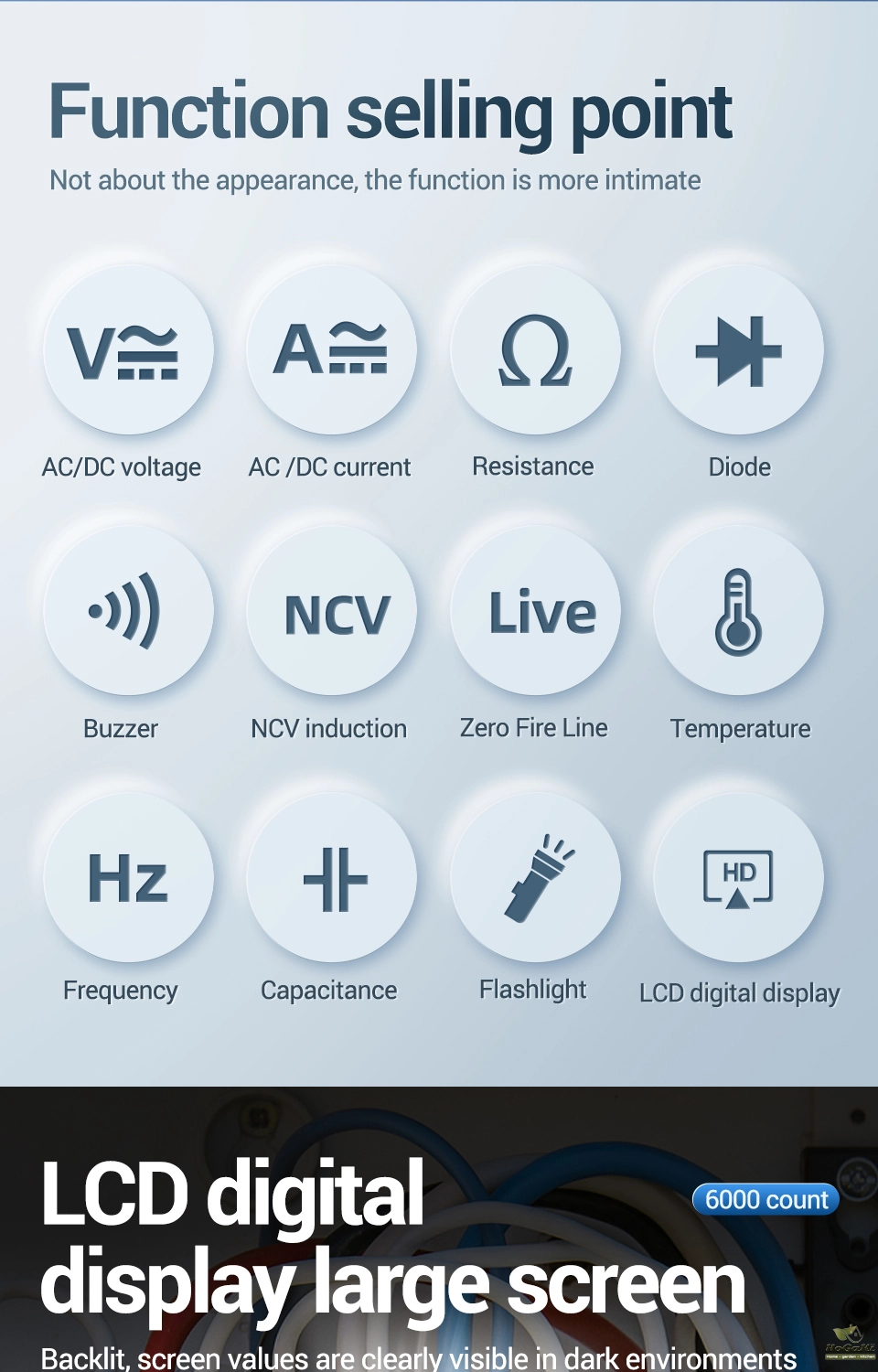 This product is a 3 5/6 digital multimeter with stable performance and reliable quality. The meter adopts LCD display screen with analog bar display.