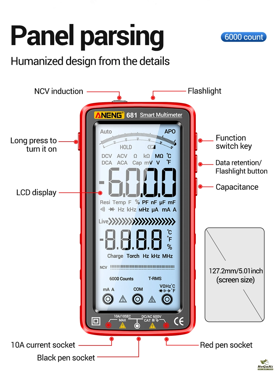 This product is a 3 5/6 digital multimeter with stable performance and reliable quality. The meter adopts LCD display screen with analog bar display.