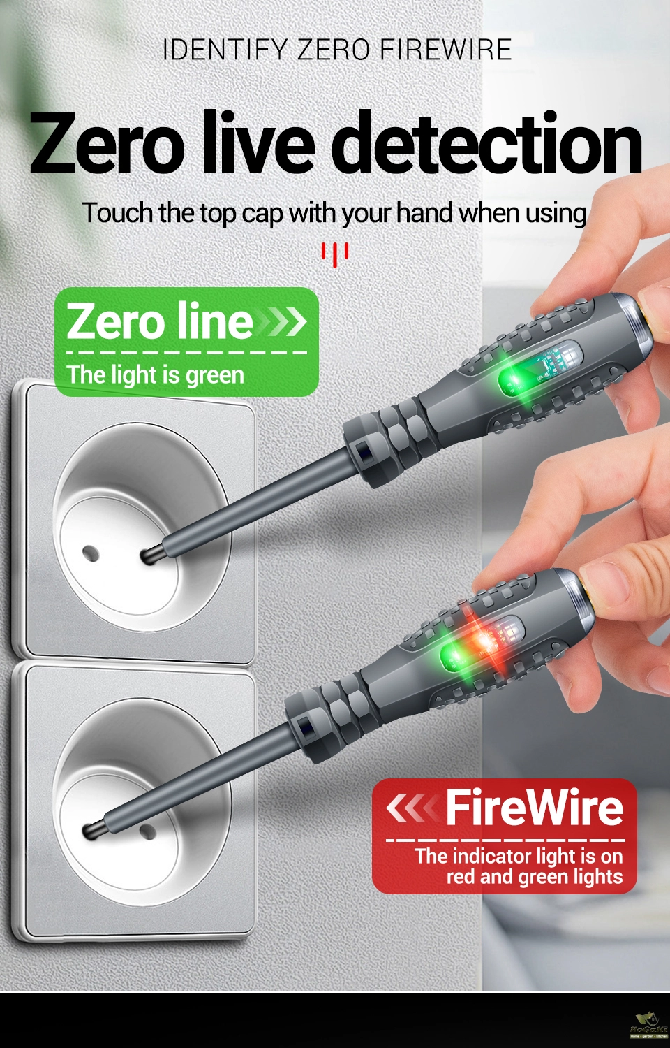 (1)Zero live wire determination: Hand touch cap test socket,the green light is the zero line, and the traffic light is the fire line.