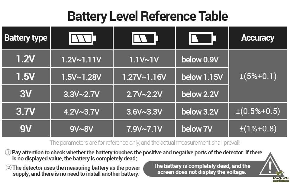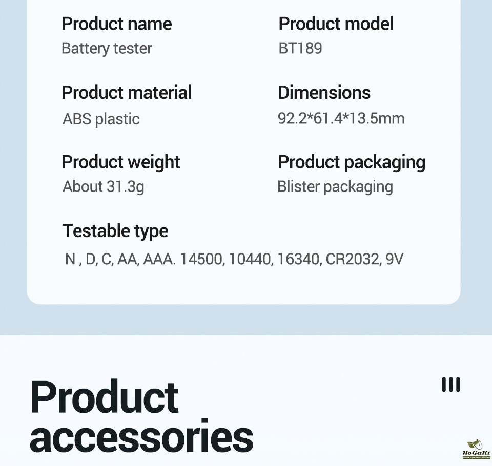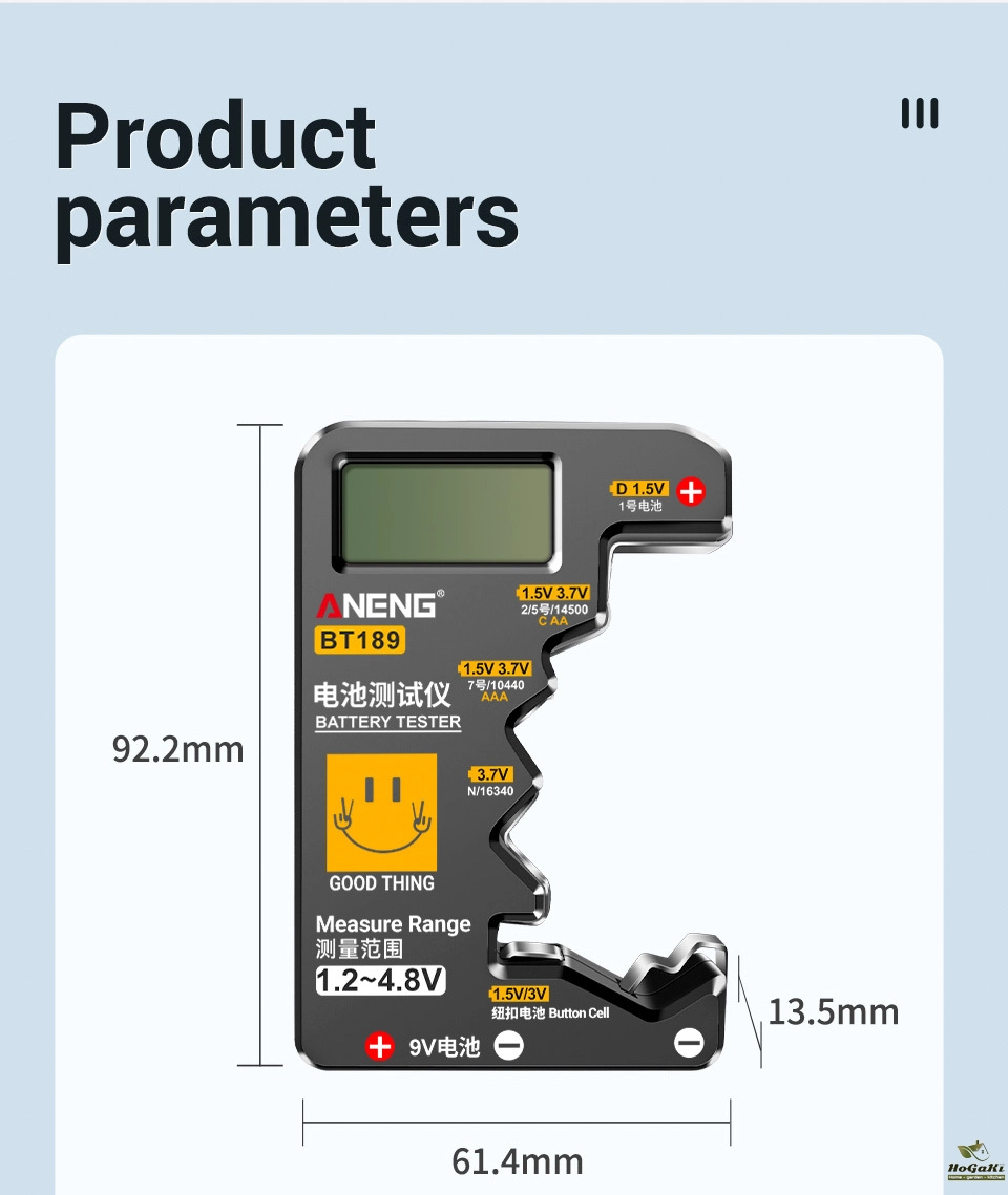 Testable type:N, D,C,AA,AAA.14500,10440,16340,CR2032,9V