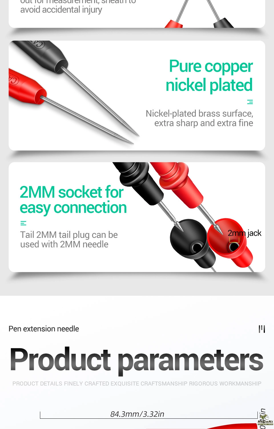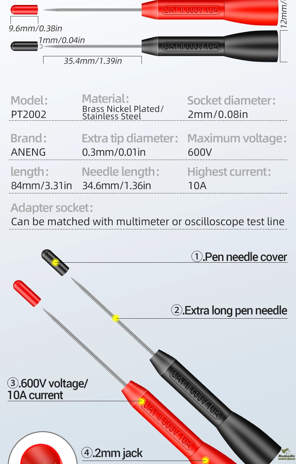 • Wide range of applications :With a test lead diameter of 2mm and the ability to withstand up to 600V, this multimeter test probe is suitable for a wide range of applications in the electrical industry.