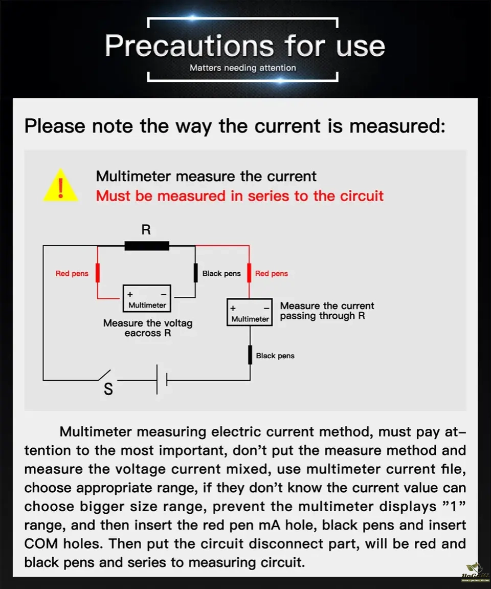3. Do not use the current and voltage ranges interchangeably to prevent damage to the instrument.