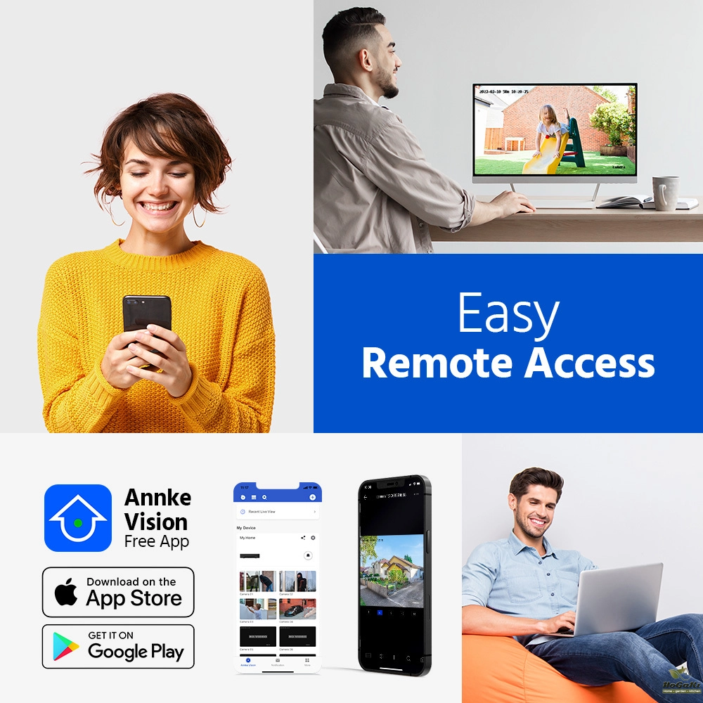 Access & control the system remotely with free ANNKE software via 3G/4G/5G or WiFi on your smartphone, tablet or computer when you are in the office or traveling. Get instant app pushes & email alerts with snapshots when there are motion events.