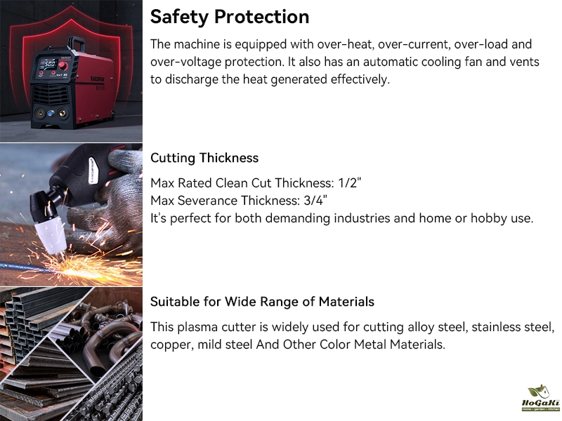 【POWERFUL CUTTING】Automatic Dual 110V/220V. This plasma cutter features high-frequency arc starting mode, efficiently cuts through rough, painted, and rusty surfaces and produces minimal slag. With advanced IGBT inverter technology, the maximum severance cut can reach up to 3/4" (20 mm), 1/2" (10mm) ideal clean cut, 60% duty cycle. Suitable for alloy steel, stainless steel, mild steel, copper, aluminum, etc.