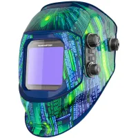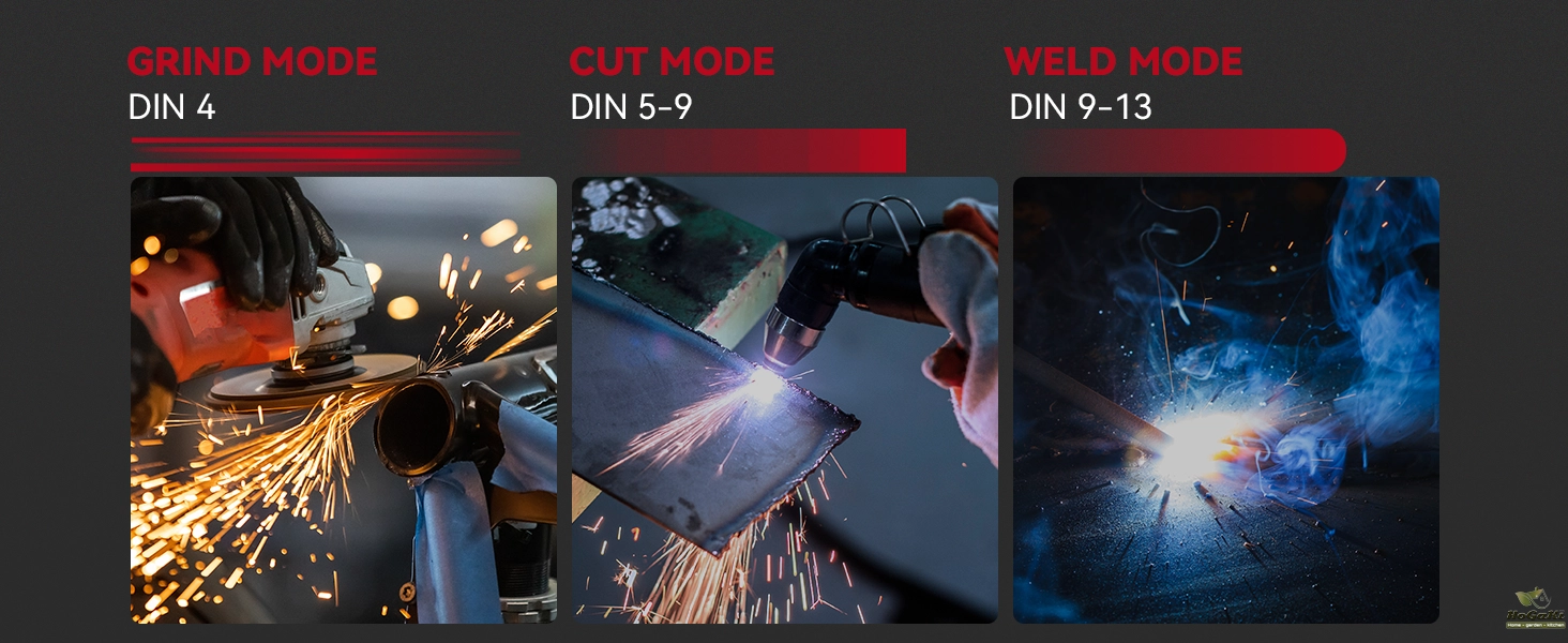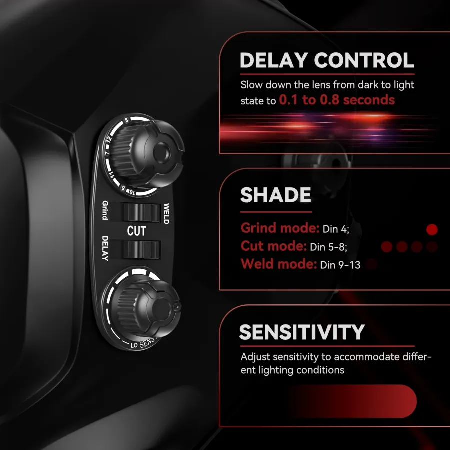 【AUTO DARKENING FILTER】This welding helmet comes with high-end auto-darkening lens and 4 premium arc sensors which let you adapt to different working environments by adjusting the lens's shade and sensitivity while you are operating ARC/MIG/TIG Welding. DIN4 on light state, DIN5-9/9-13 on dark state.