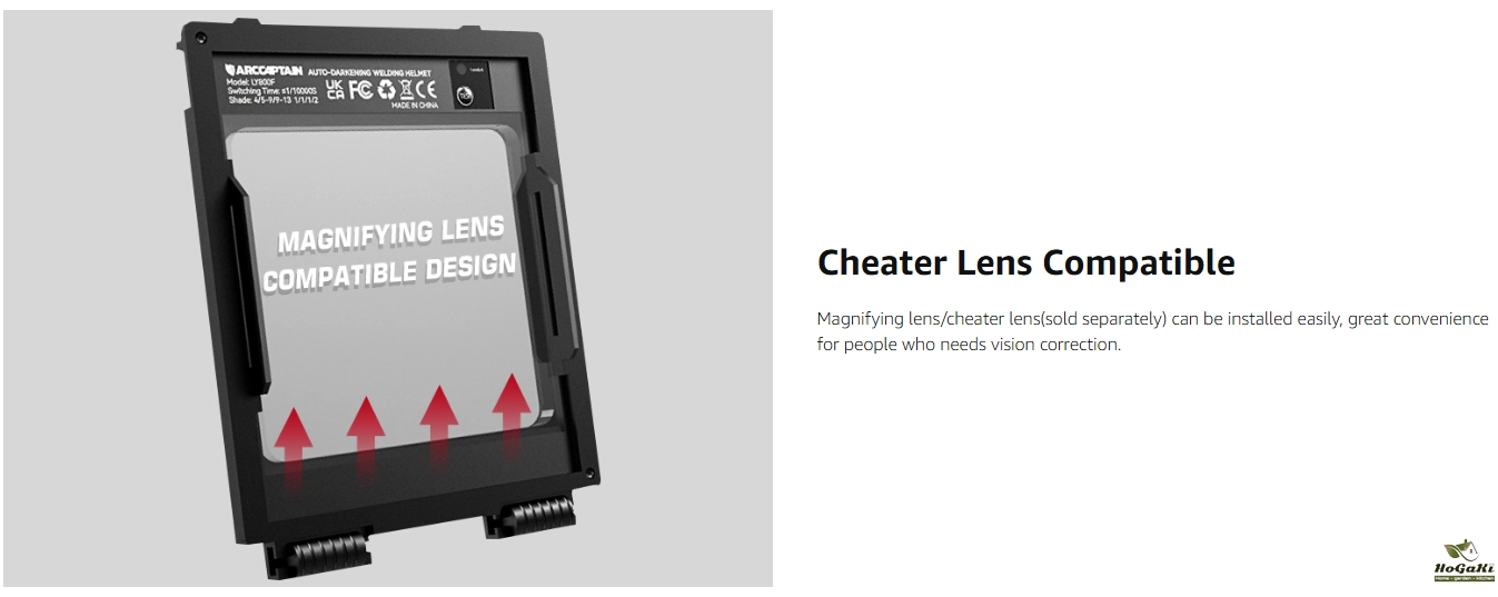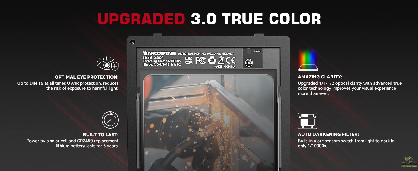 【BUILT TO LAST】The welding hood auto darkening was made of PP strong material, it features shock resistance and flame Resistant. It meets ANSI Z87.1/ EN379 CE/ CSA Z94.3 compliant. Power by the solar cell and CR2450 replacement lithium battery supports long-lasting working time and is eco-friendly.