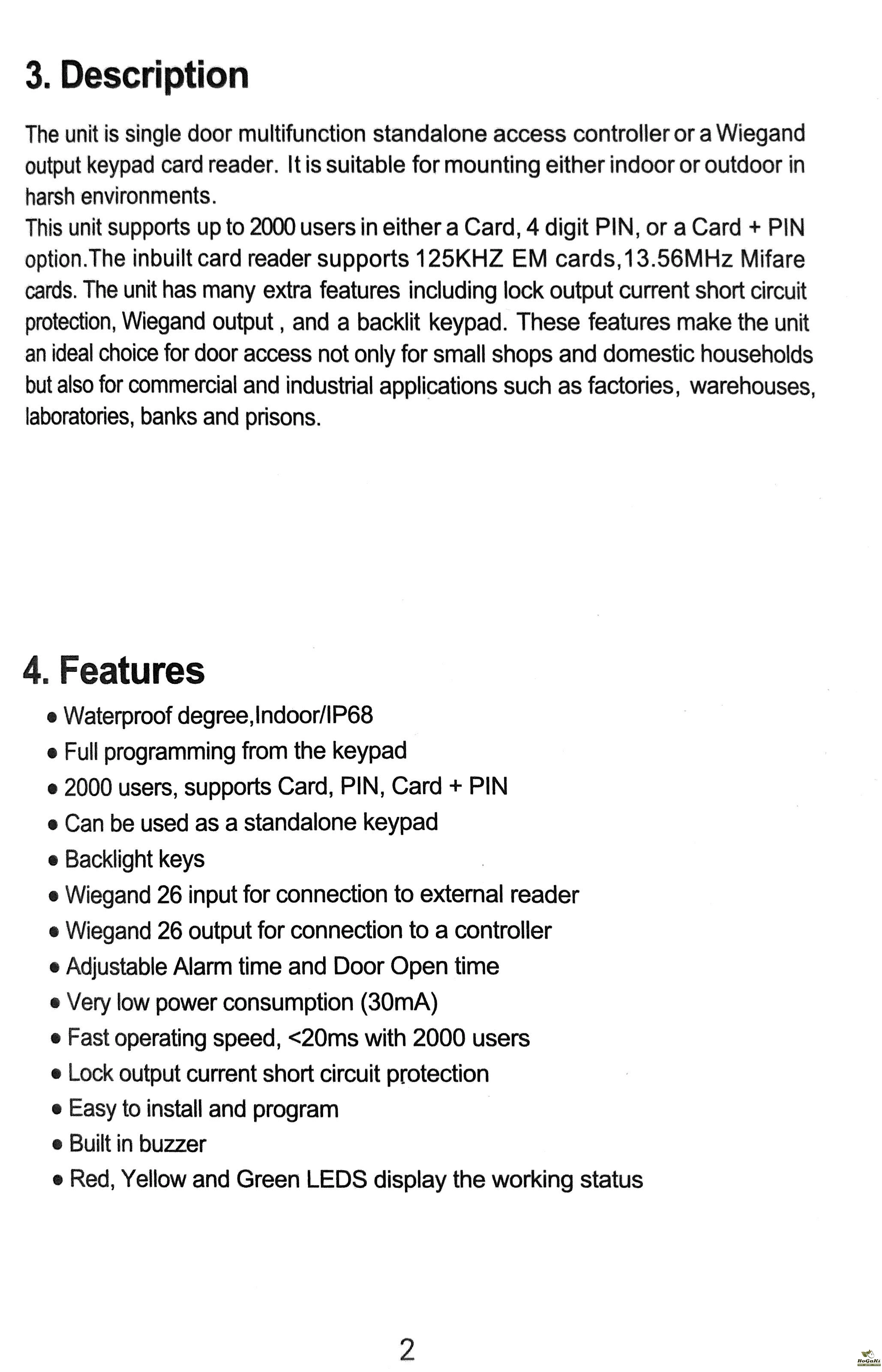 11.Built-in proximity card reader (125KHZ ASK modulation)