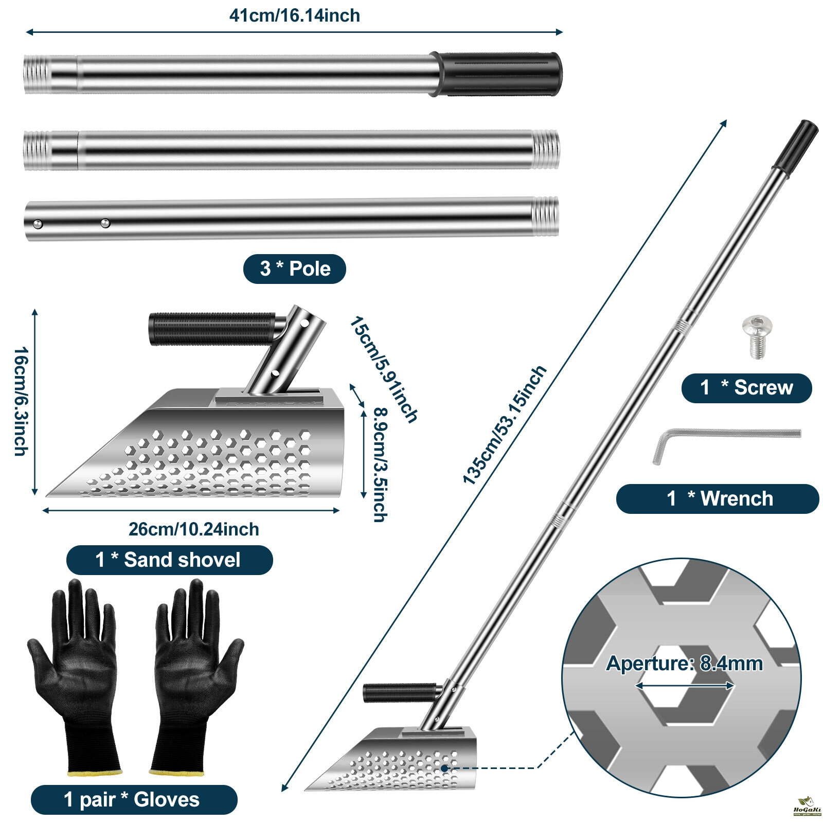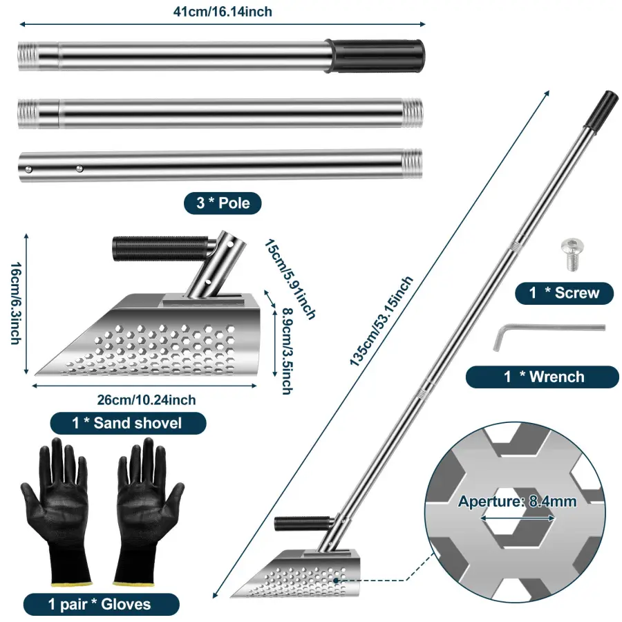 8.5 mm Hexahedron Hole: The beach scoop shovel is sturdy and reliable, suitable for sandy areas and water areas. There are 8.5 mm hexagonal holes on the scoop, and sifting sand by hand is a thing of the past, making sand removal easy and efficient