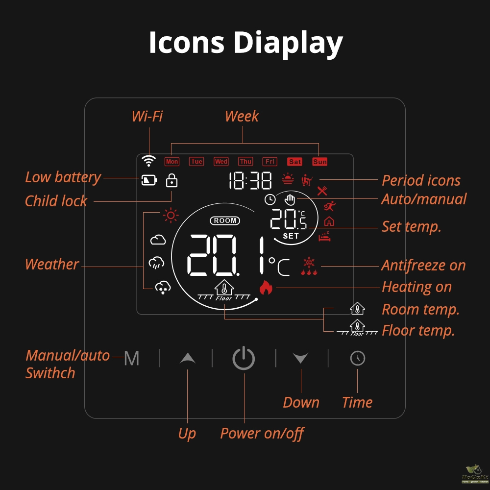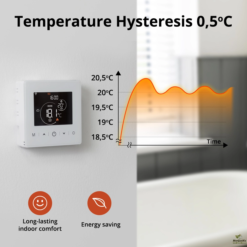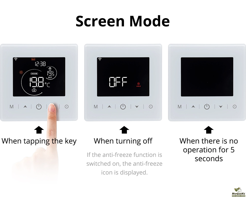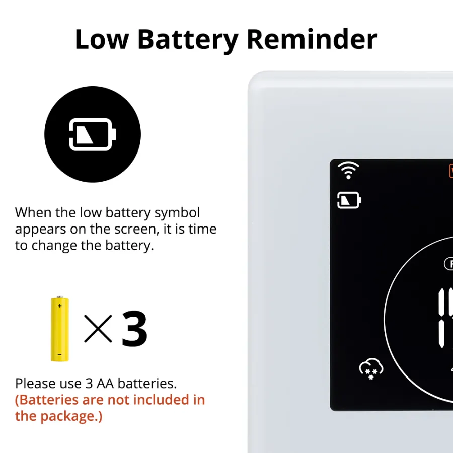 The device has 5 touch buttons and a 2.8-inch VALCD screen, providing excellent interaction. It uses high-precision temperature sensors and high quality relays to provide good temperature measurement and temperature control effects, giving you a comfortable and warm home. In addition, it is easy to install and the battery is convenient to replace.