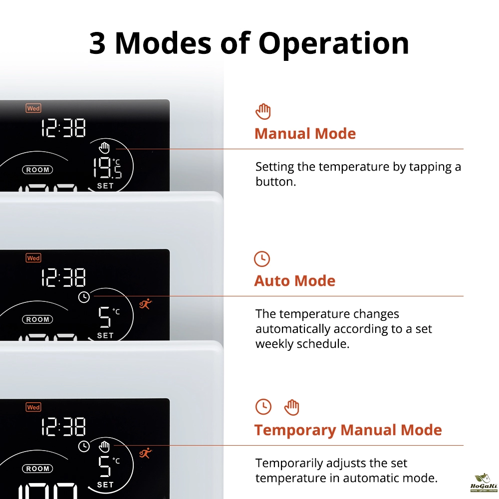【Operation mode】The thermostat has three operating modes: manual mode, programming mode, and temporary manual mode.