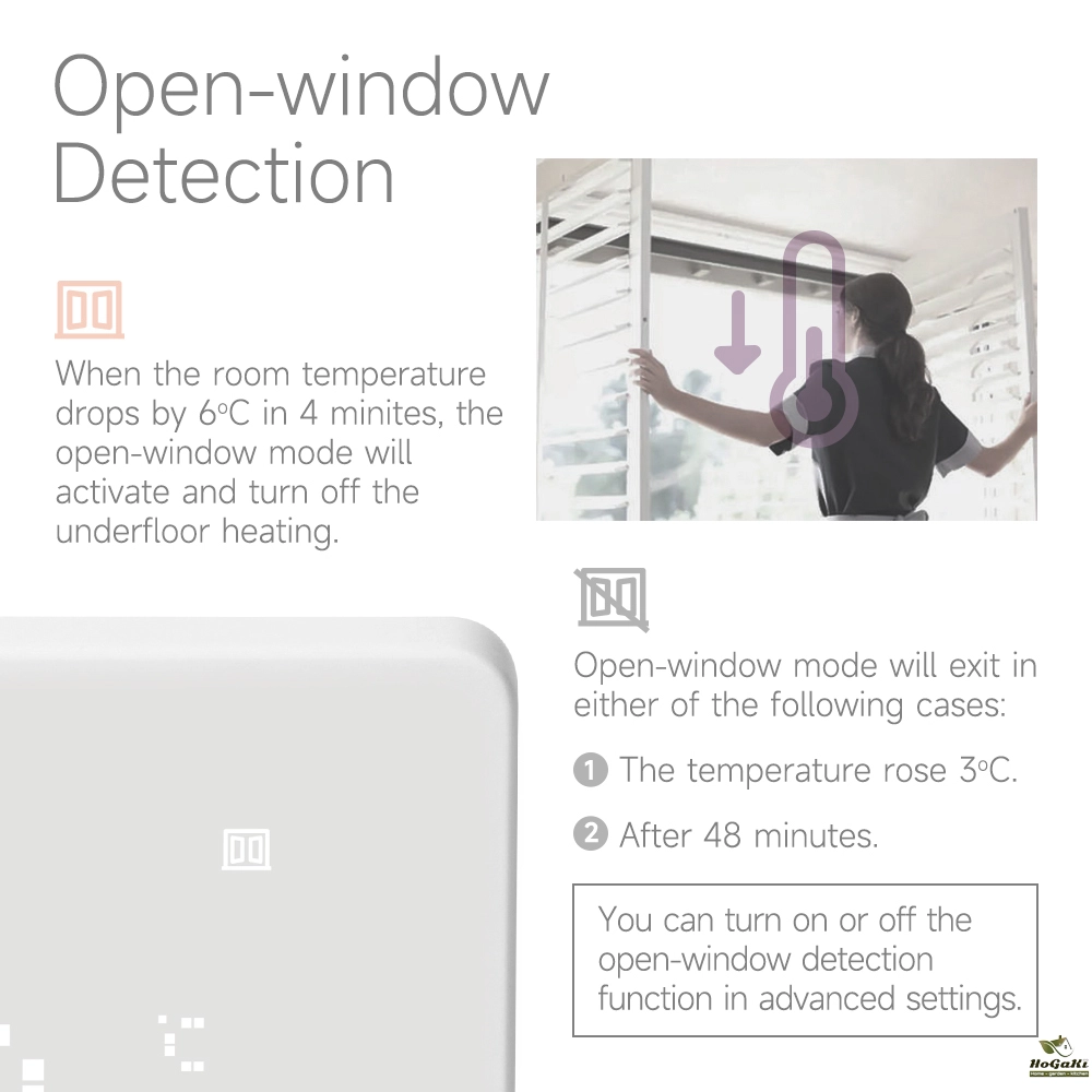 【Window opening function】When the temperature controller detects a short-term decrease in indoor temperature, it will automatically stop heating, saving heating costs for your home.