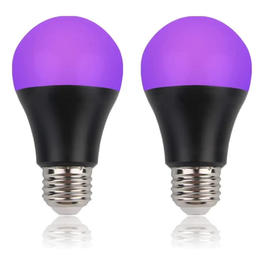 [FEATURE] 9W LED black light bulbs made of clear PC cover and alumimum. When energized, the shell looks purple. Working Voltage: AC85-265V. UVA LEVEL 390-400nm. Not dimmable.