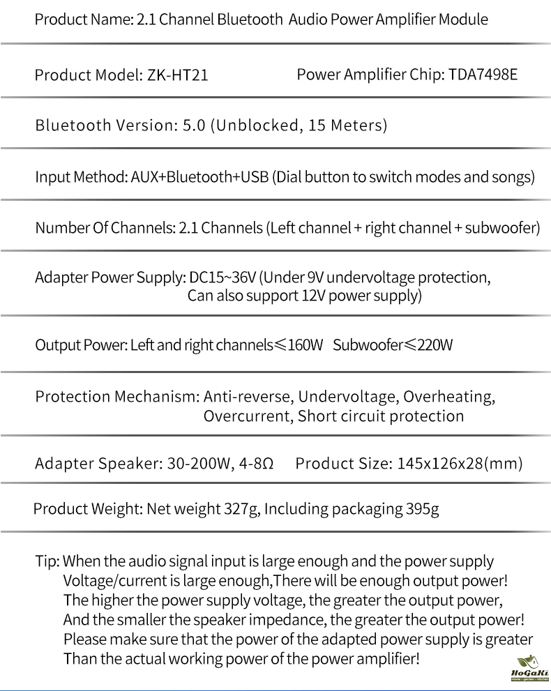 The higher the power supply voltage, the greater the output power, the smaller the speaker impedance, and the greater the output power! Please ensure that the power of the adapter is greater than the actual working power of the amplifier