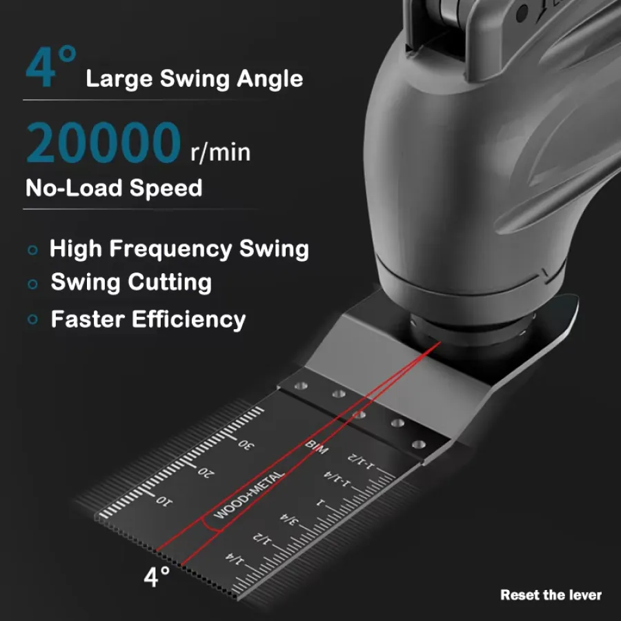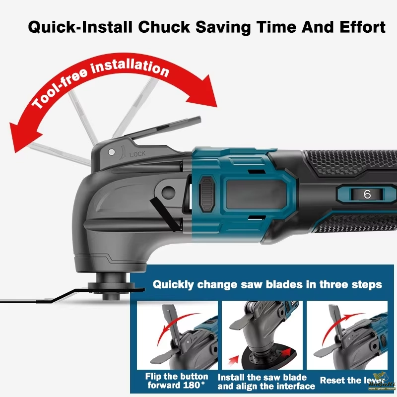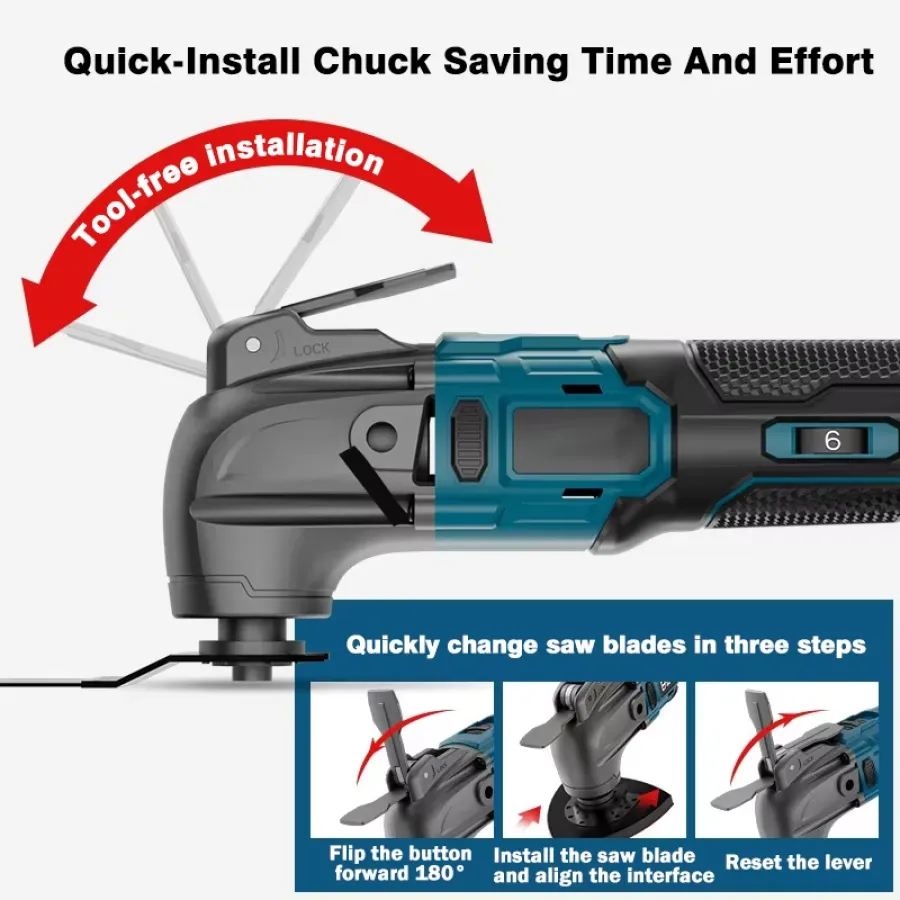 4.Universal interface for quick change accessories. The quick-release lever allows for tool-free blade replacement, and holds accessories firmly in place.