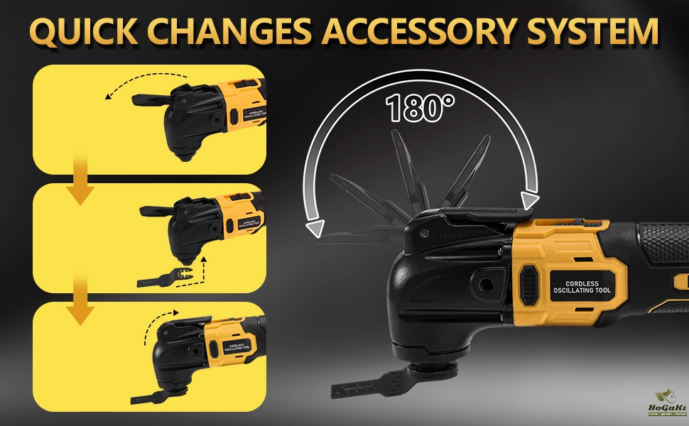 【Quick-Change Accessory System】Quickly install blades in 3 steps, no tools required. Step 1: Lift the control lever to 180°degrees. Step 2: Install the blade. Step 3: Lock the control lever into place.