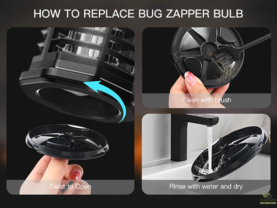 The electric bug zapper is designed for convenient cleaning with a removable bottom tray to collect insect debris and includes a cleaning brush for maintaining the internal grid. Always remember to unplug the unit before performing any maintenance