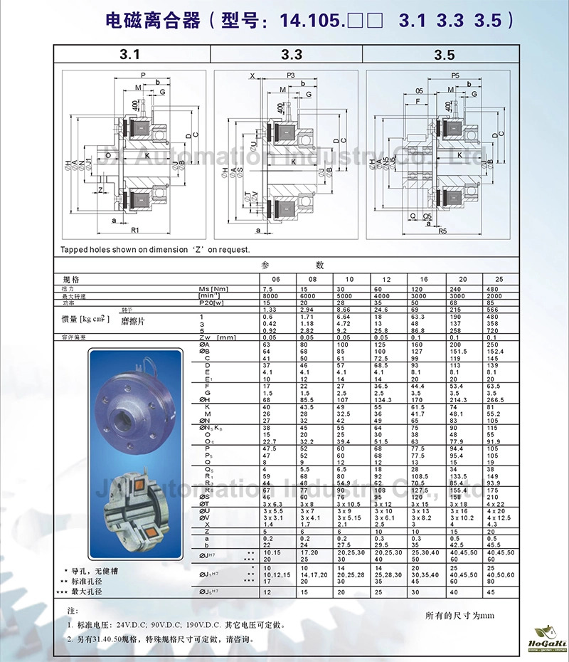 The electromagnetic clutch (14.105 series) is divided into two series: dry single-plate clutch and built-in bearing clutch. The electromagnetic clutch is in the off state when the power is off, and the armature plate is separated from the armature; when the power is on, the armature plate is in the closed state. It is attracted to the armature.