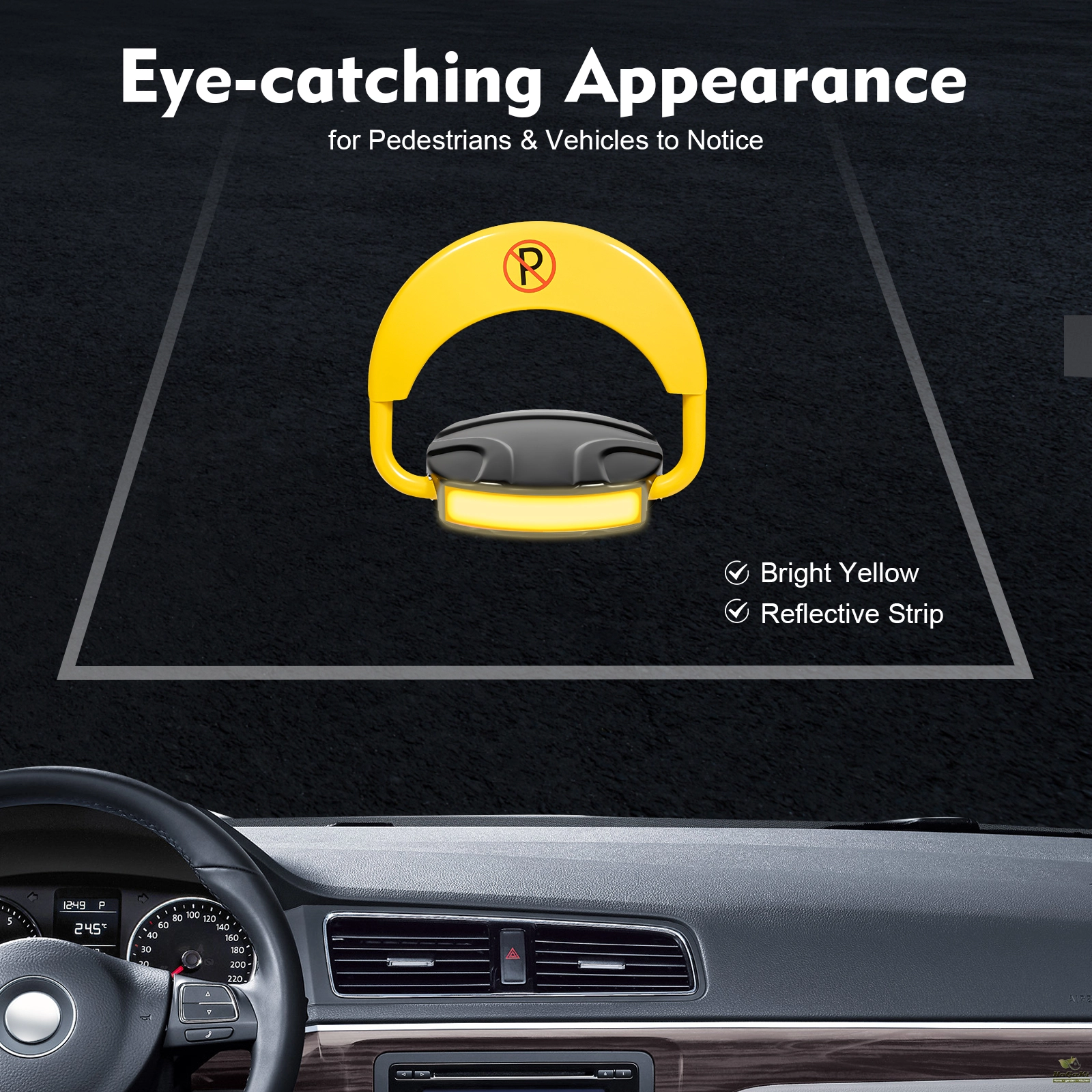 Eye-catching Appearance: The prominent bright yellow and the red no-parking sign make our remote parking lock very eye-catching; The equipped reflective strip allows pedestrians and vehicles to notice it even at night or in dimly lit garages.