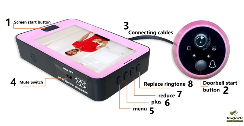 1,Screen start button 2,Doorbell start button 3,Connecting cables 4,Mute Switch