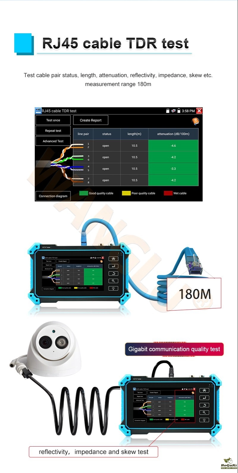● RJ45 TDR cable test, test cable pair status, length, attenuation, reflectivity, impedance, skew etc, can create test report