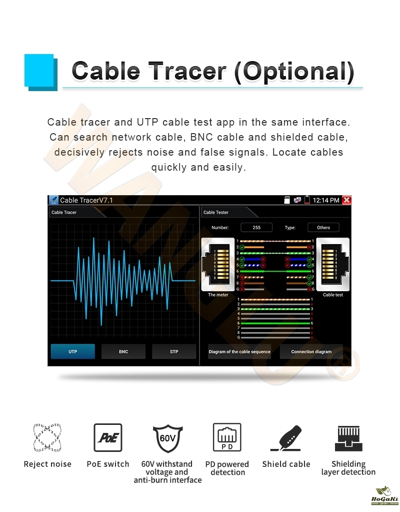 ● UTP cable test, detect the near-end, mid-end and far-end fault pointof the RJ45 cable plug