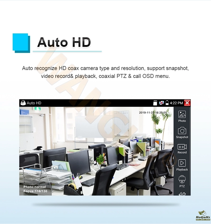 ● Auto HD app, auto recognize HD coax camera type and resolution, support snapshot, video record & playback, coaxial PTZ & call OSD menu