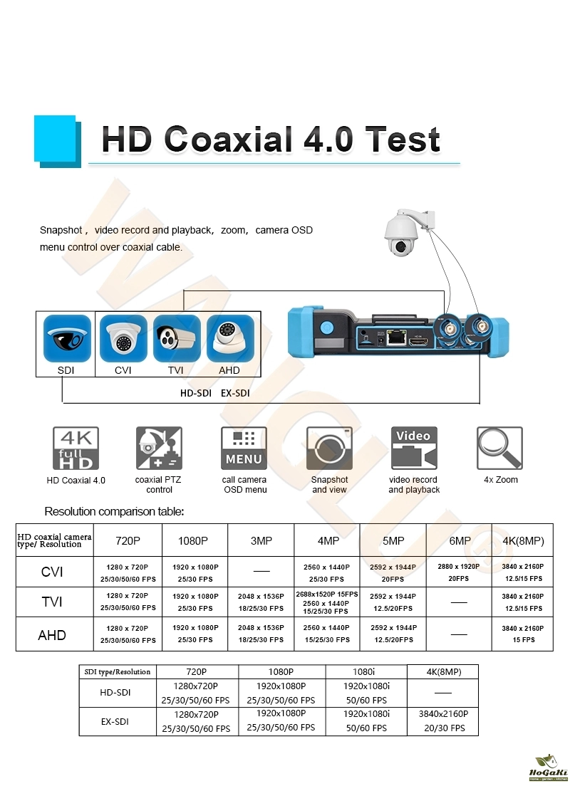 ● HD-SDI test, 1920 x 1080P 25/30/50/60 FPS, 4xzoom, video record & playback, coaxial PTZ & call OSD menu