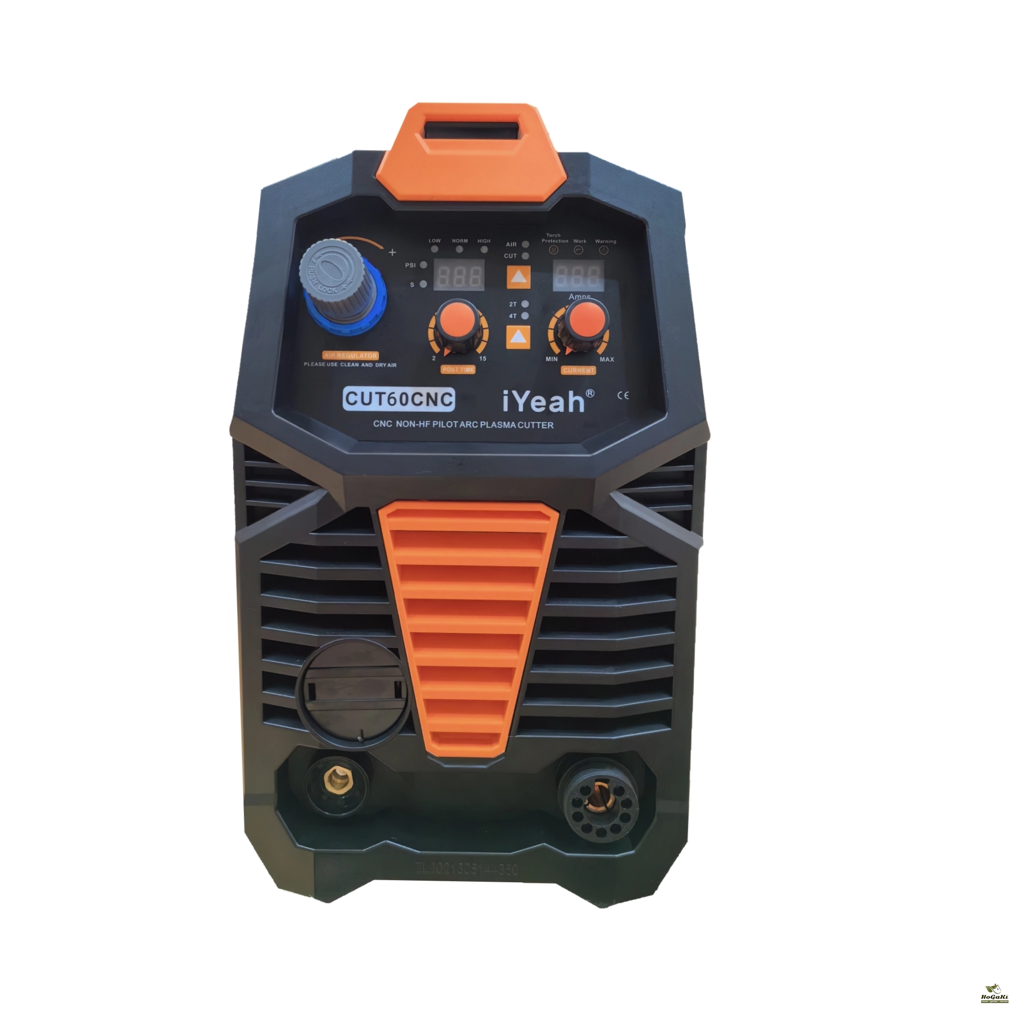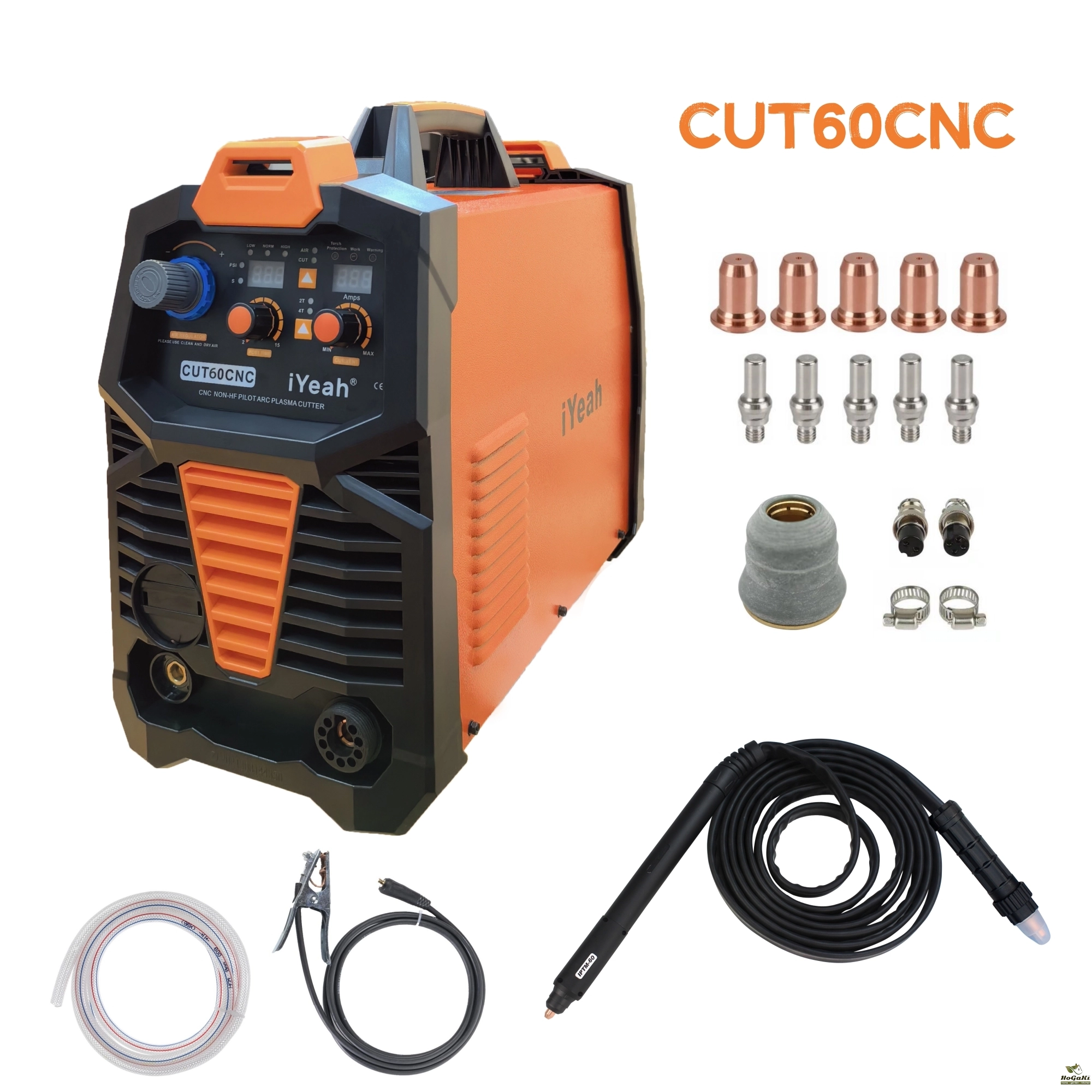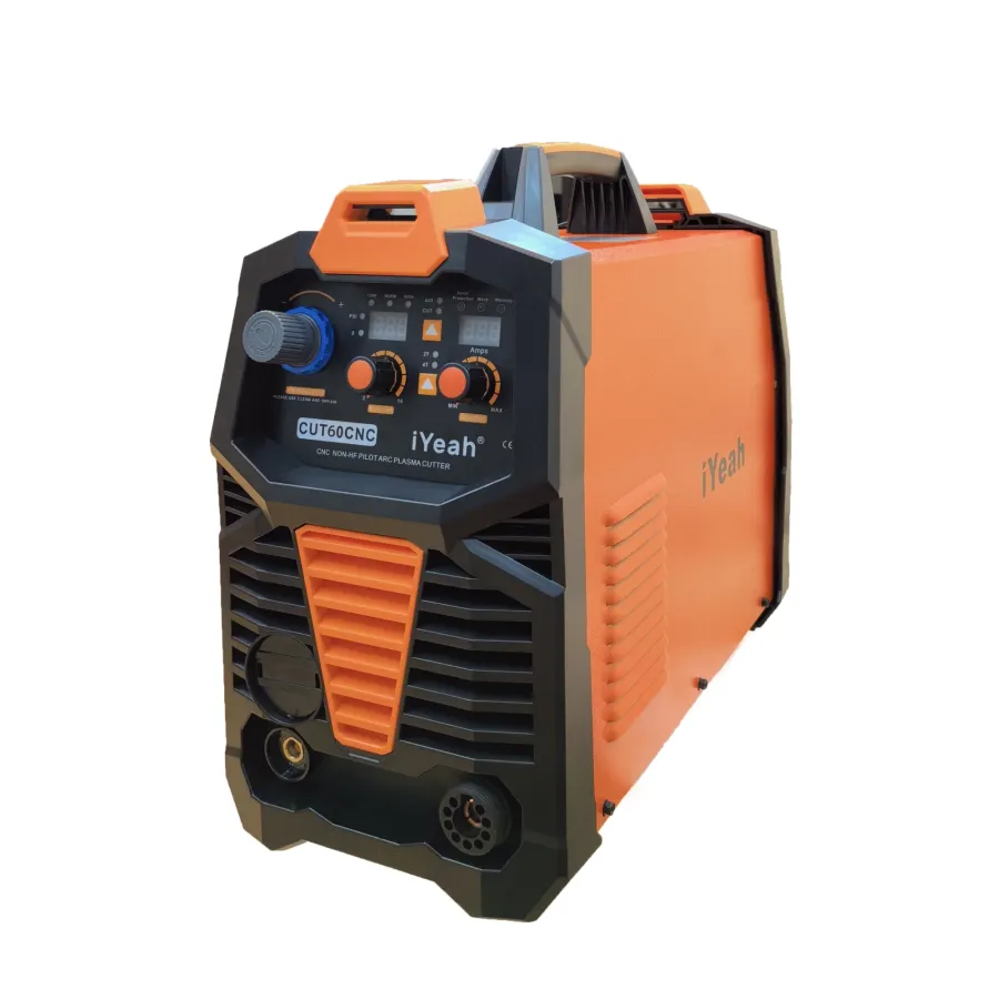 IGBT Non-HF Pilot arc Plasma cutting machine CUT60CNC is developed by iYeah Technology Co., Ltd, On rear of machine have CNC port, Can easy with CNC system. Non-HF pilot arc Heavy Duty efficient Digital controller. This machine is single phase/three-phase inverter cutting machines on the market. With quality torch fixed safety plasma plug, The fast connection quick to release torch and ground clamp. The machine is easy to operate in terms of settings, Display show cutting amps help user adjust the current to cut different metal. Cutting thickness for this machine is 20mm at 70 psi with good performance, Max cutting thickness can reach at 25mm if needed for a short run. Torch standoff and 5 set of consumables included.