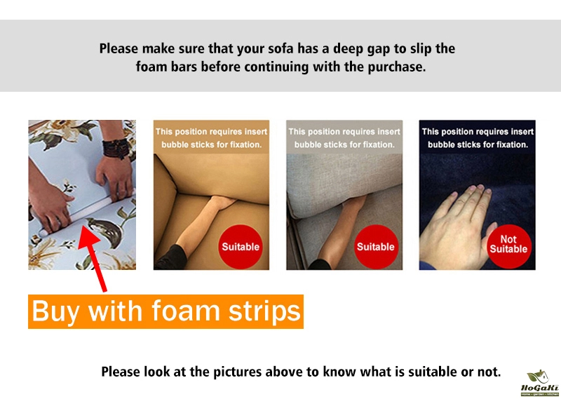 1. This sofa cover applicable to sofa which there is a gap,between seat with backrest and armrest.(Please make sure that your sofa has deep gap to slip the foam bars before purchase.Our sofa cover is not suitable for the sofa with shallow gap.)