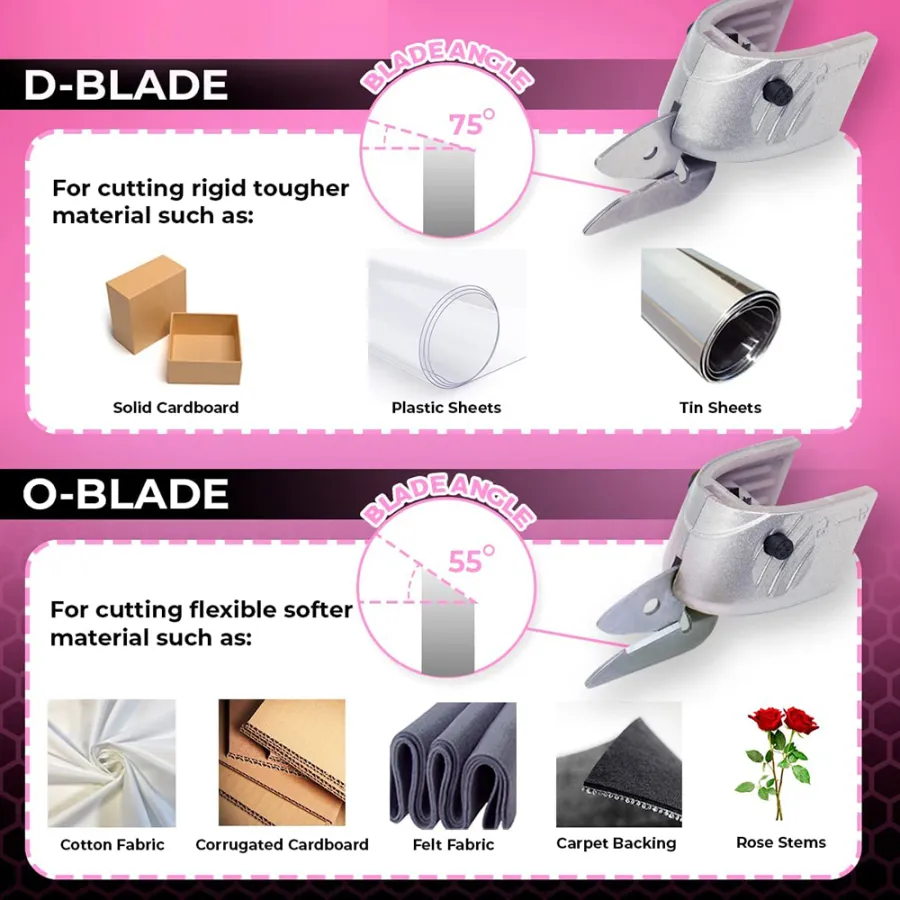 "D" Blade suitable for cutting tougher harder materials; "O" Blade suitable for cutting flexible softer materials.