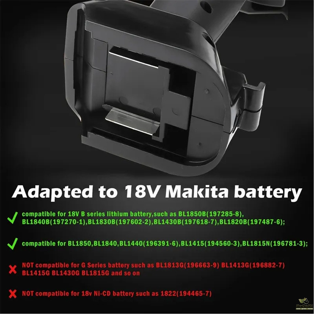 - Compatible for 18V B series lithium battery,such as BL1850B(197285-8),BL1840B(197270-1),BL1830B(197602-2),BL1430B(197618-7),BL1820B(197487-6)