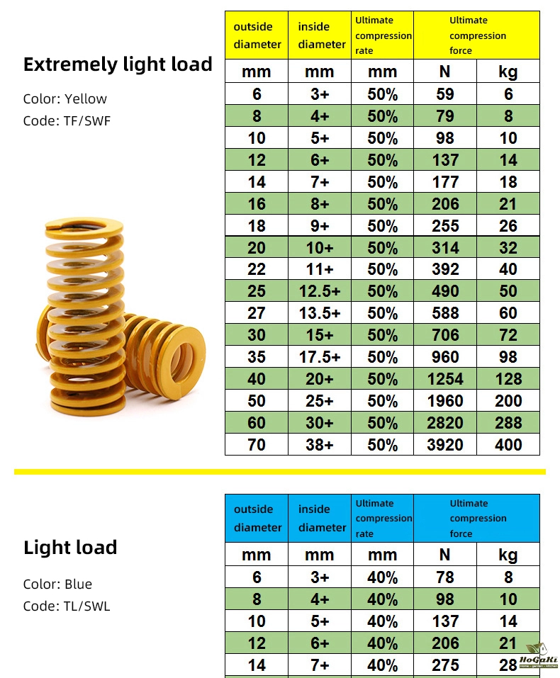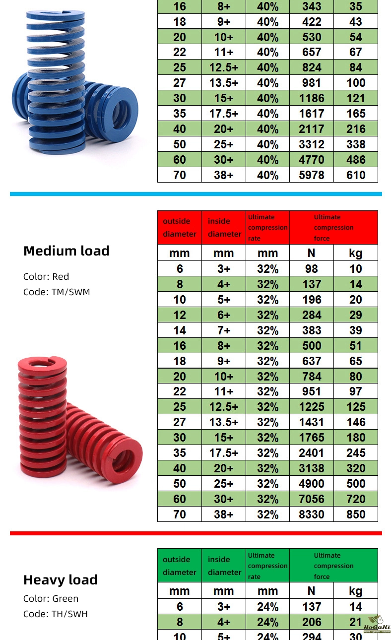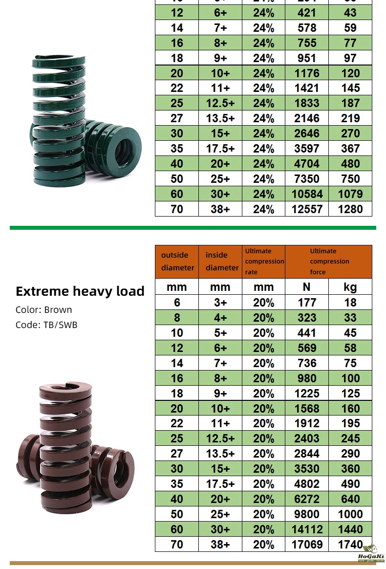 【Applicable fields】: Mold springs are widely used in stamping dies, metal die-casting dies, plastic molds, and other elastic motion precision machinery and equipment. Description: Yellow and blue are mainly used for plastic mold assembly. Red, green and brown are mainly used for hardware assembly.