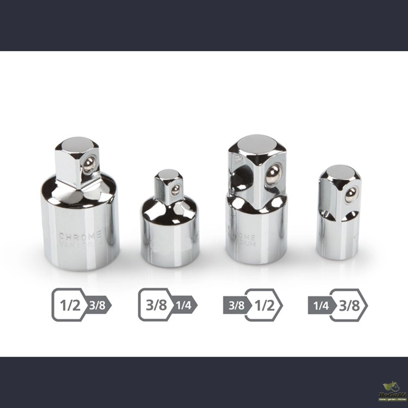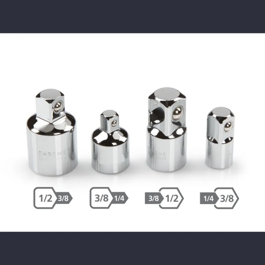 Be prepared for the unexpected with the 4pc. Adapter and Reducer Set. These problem solvers create a solution for lost or broken sockets, fill the gaps in incomplete size ranges, and extend the capability of your existing socket system. Made from premium chrome vanadium steel, they are precisely heat treated for superior strength and protected by a durable, corrosion-resistant mirror chrome finish.