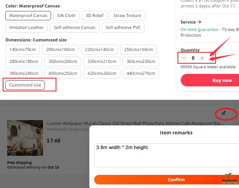 If you need 8 square meters, please choose "Customized size" and "Quantity 8" here.