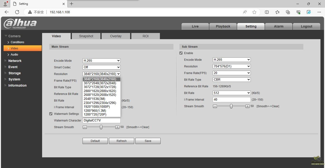 Resolution | 3840 × 2160 (3840 × 2160); 3072 × 2048 (3072 × 2048); 3072 ×1728 (3072 × 1728); 2880 × 1620 (2880 × 1620); 2688 × 1520 (2688 × 1520); 3M (2048 × 1536); 2304 × 1296 (2304 × 1296); 1080p (1920 × 1080); 1.3M (1280 × 960); 720p (1280 × 720); D1 (704 × 576/704 × 480); VGA (640 × 480); CIF (352 × 288/352 × 240) | ||||||||||||||||||||||||||||||||||||||||||||||||||||||||||