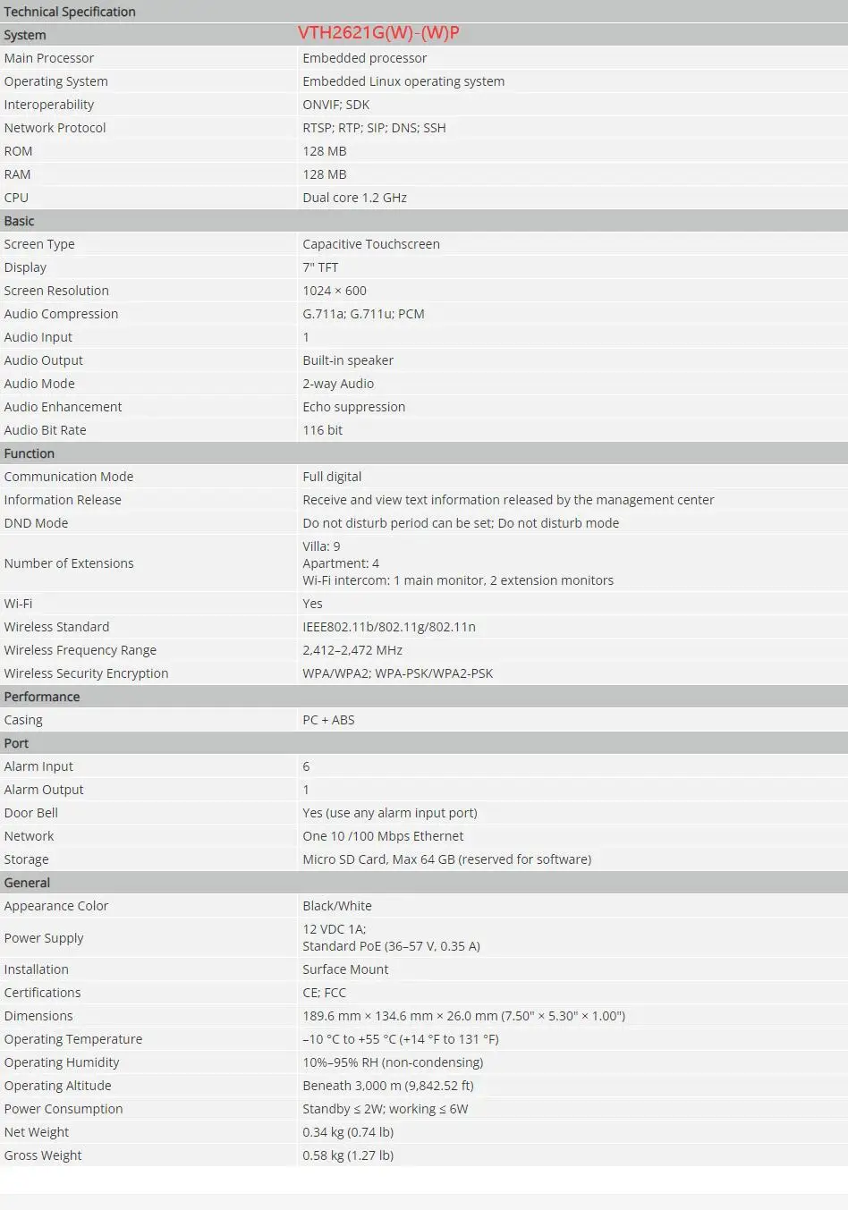 VTH2621G(W)-WP IP & Wi-Fi Indoor Monitor