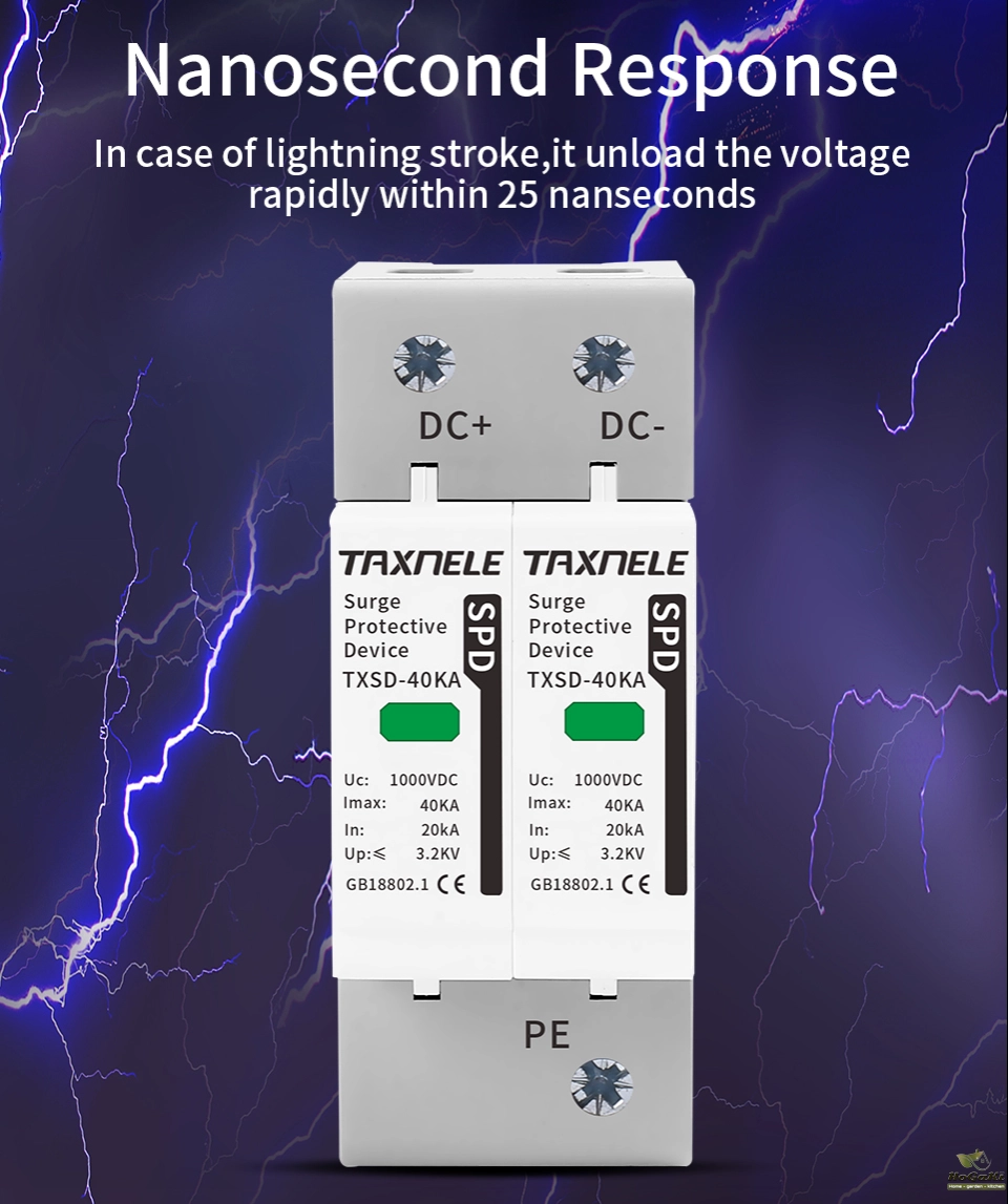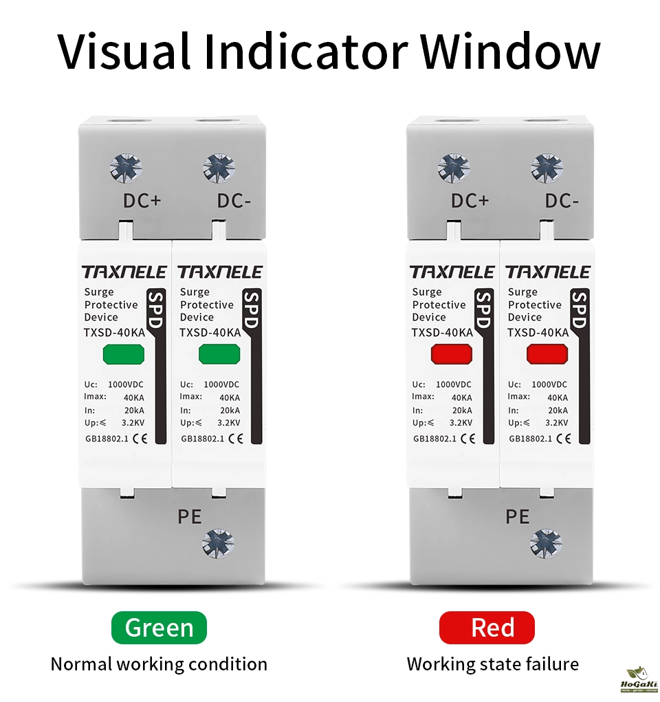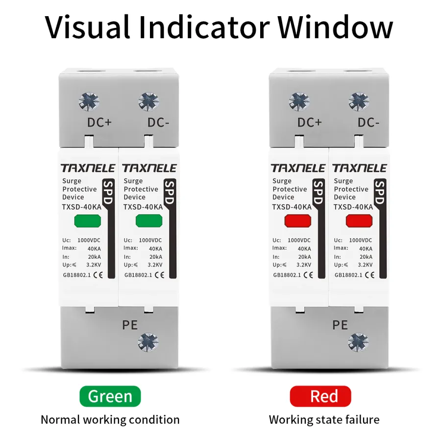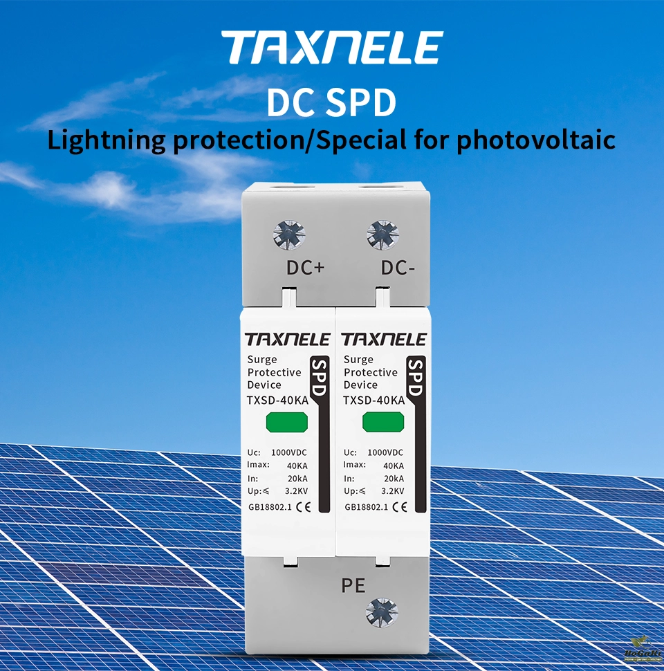 Surge protective device, protect against lightning surge voltages in solar system (photovoltaic power supply system). These units must be installed in parallel on the dc networks to be protected and provide common and different modes protection. Its installed location are recommended at both ends of the dc power supply line (solar panel side and inverter/converter side), especially if the line routing is external and long. High energy MOVs equipped with specific thermal disconnectors and related failure indicators.