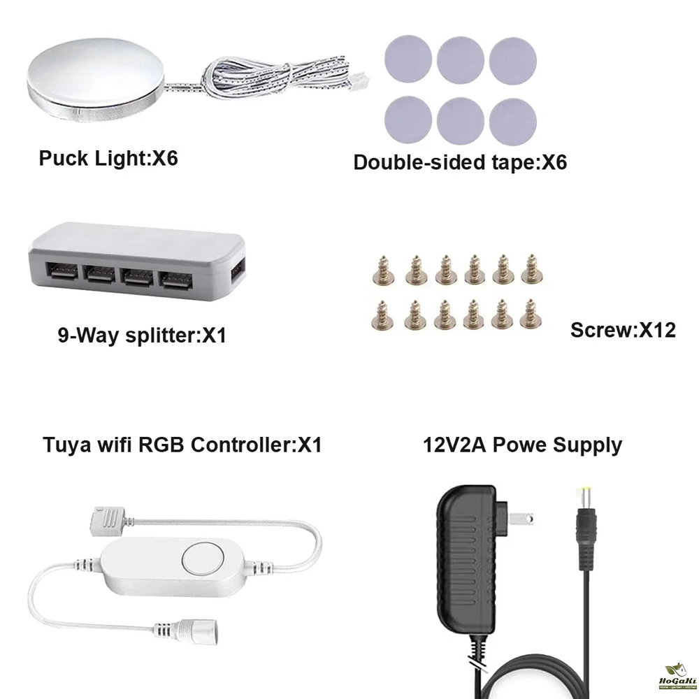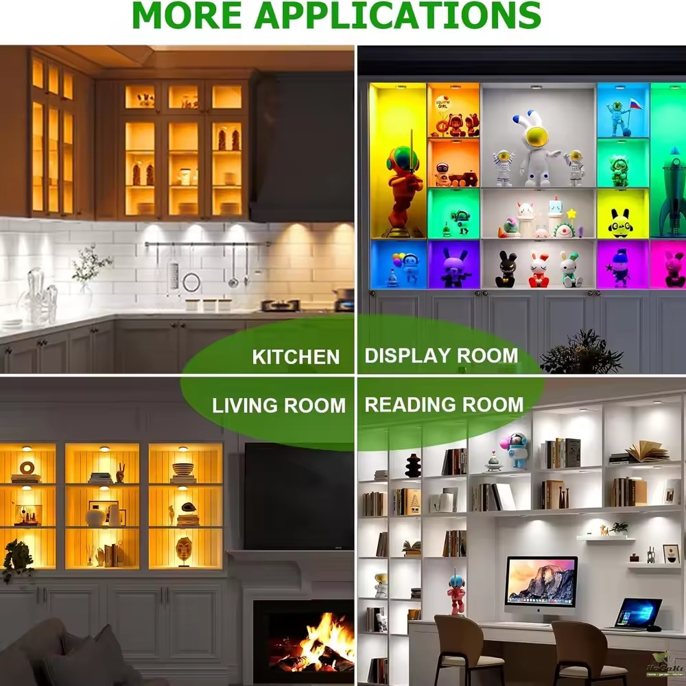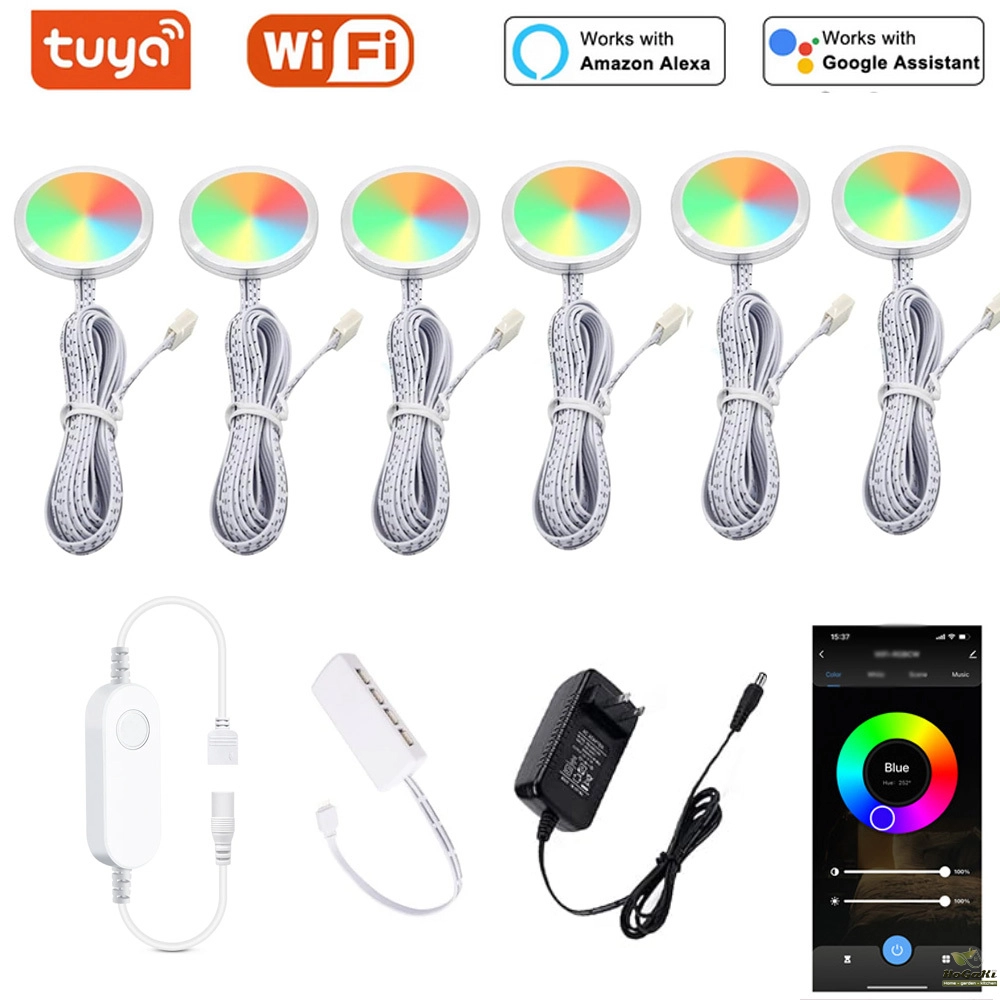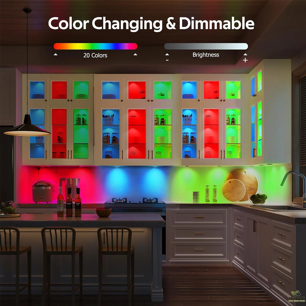 Multi-Function RGB color changing LED Under cabinet lighting with ZIGBEE 3.0 wireless remote control dimmable puck lights kit for kitchen furniture mood lighting.