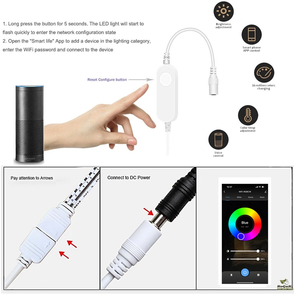 How to use it?1.Connect this wifi strip light controller to the LED light strip via the 4 pin connector, and also connect to power via the DC port with the power adapter of the light strip.