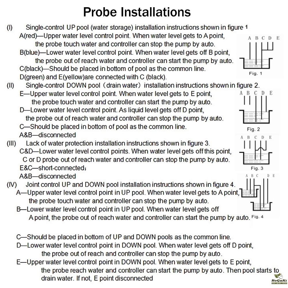 E-limit pond level control for the next point, the water level rises to the point E water level, water in contact with the probe, the water level controller automatically open the pump, pond discharge head; Without drainage, the E point is not connected.