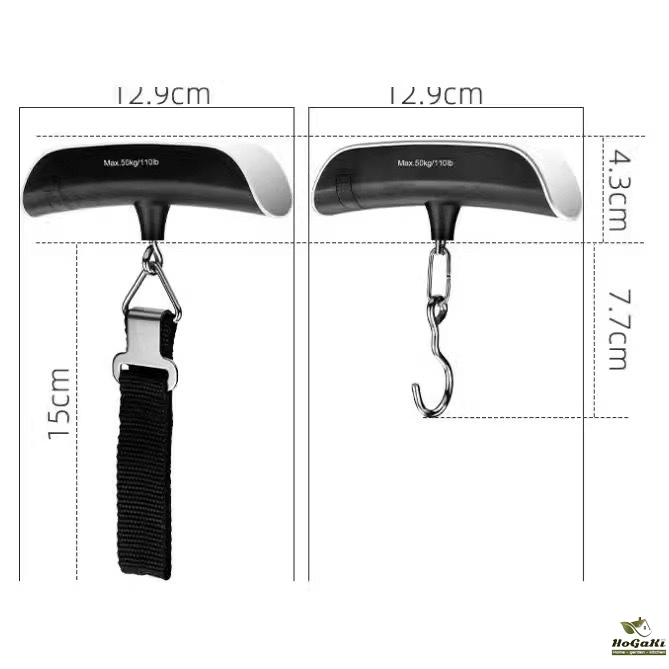 Color: As you see in the pictureMax capacity: 110 lb/50 kgGraduation: 0.02 lb/10 gBacklight: greenSize: 130 x 30 mmPower: 1 x 3V lithium cell (CR2032) Battery ( battery is not included )Button functions:-Switch / Z / T button: Power on or off, zero tracking / tare mode ( press the button for 2 seconds to power off )UNIT button: Press it to convert the units in kg Lb -Deg. C -Deg. F (1kg = 2.2Lb)- Durable braided strap + strong metal hook
