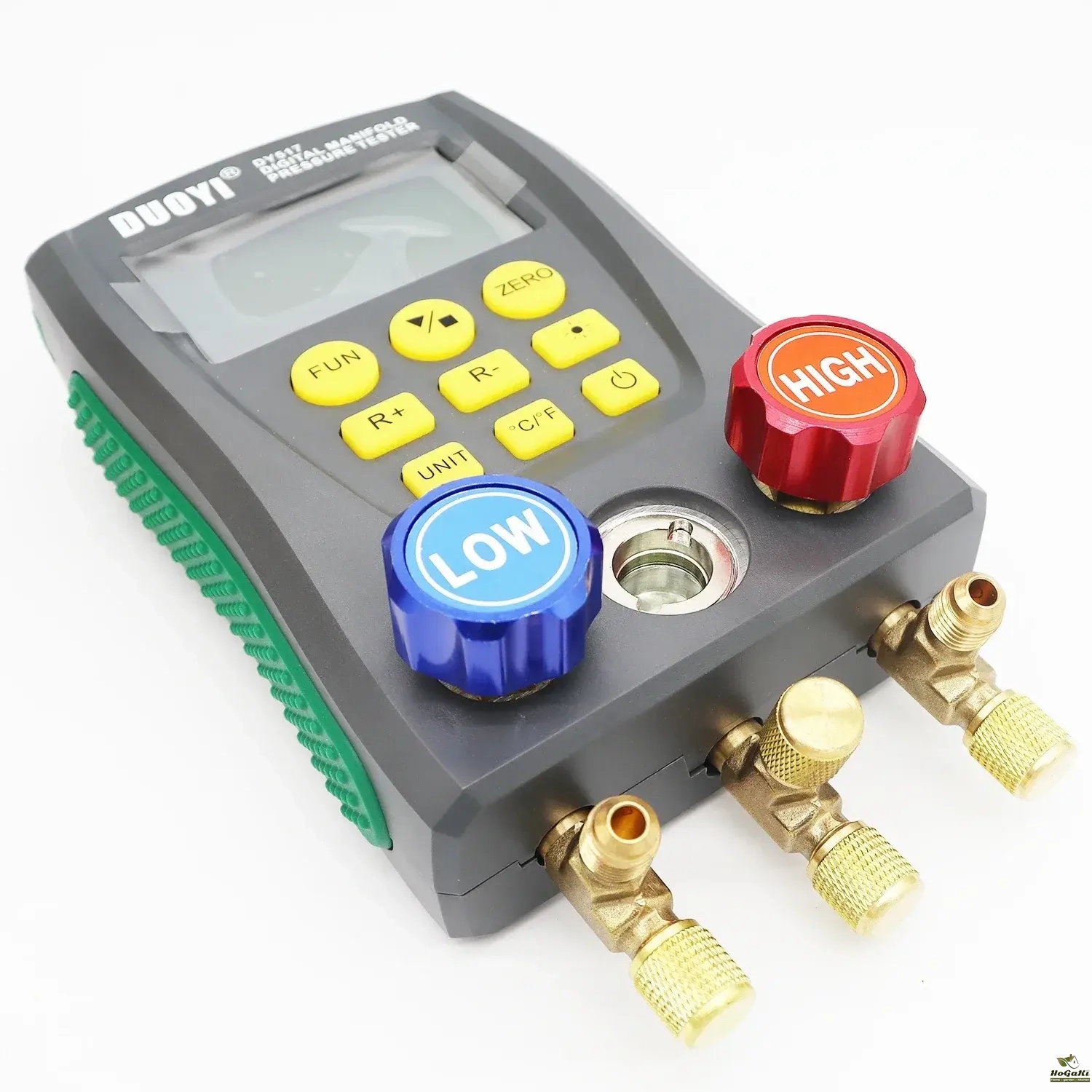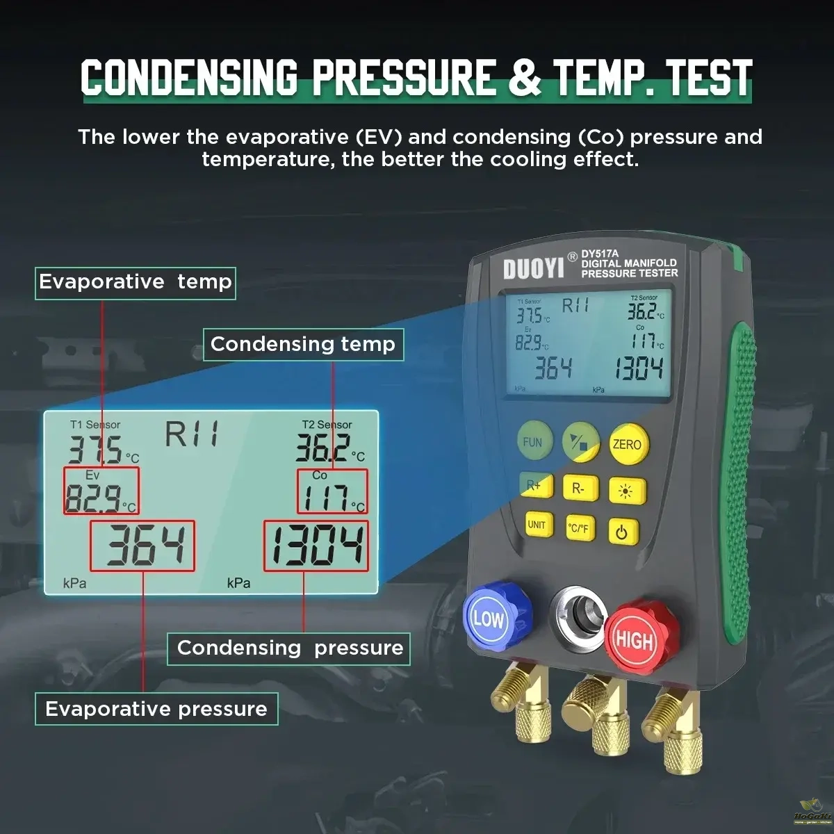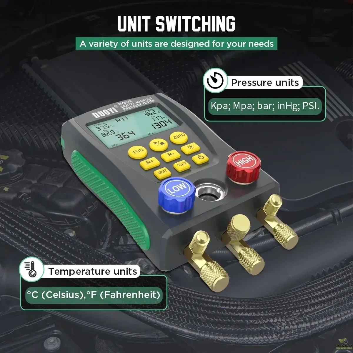 Also it tests percentage of vacuum measurement; pressure leak measurement, leak time speed record. It is deserved to have this multi-functional, accurate and simply operated digital manifold let you do the job right.