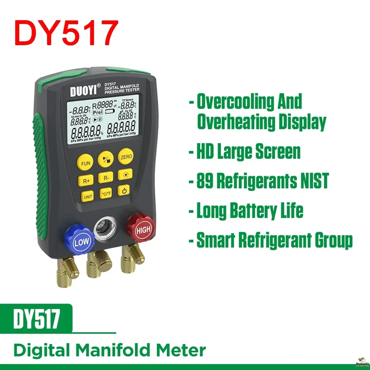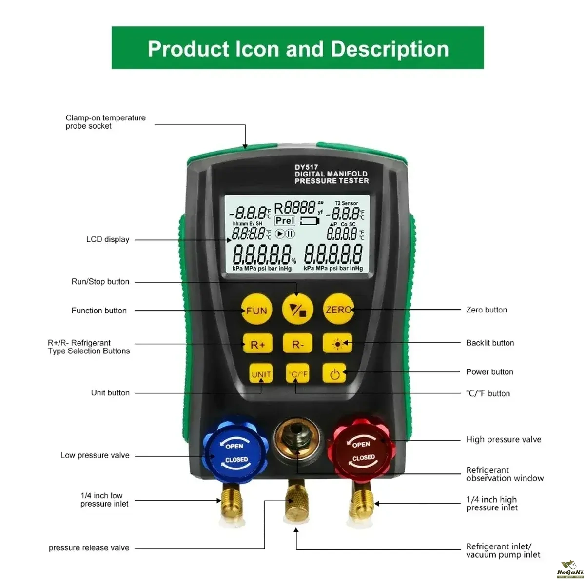 Large-size liquid crystal display, LCD backlight support, data display clear and easy to read, convenient light operation. Long-life valve switch, 1/4-inch standard interface design to ensure that the instrument's durability and versatility.
