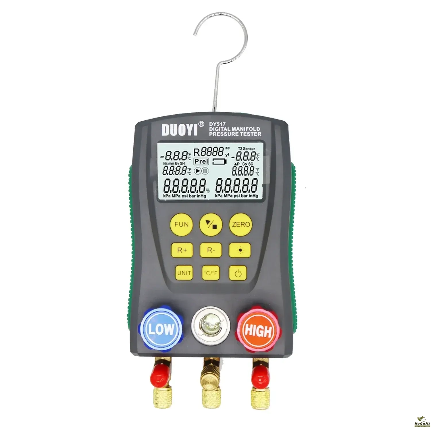 The instrument can measure double pressure (gauge pressure) at the same time, as well as dual temperature measurement , with automatic multi-unit pressure conversion, automatic conversion of temperature Celsius / Fahrenheit, to facilitate different needs.