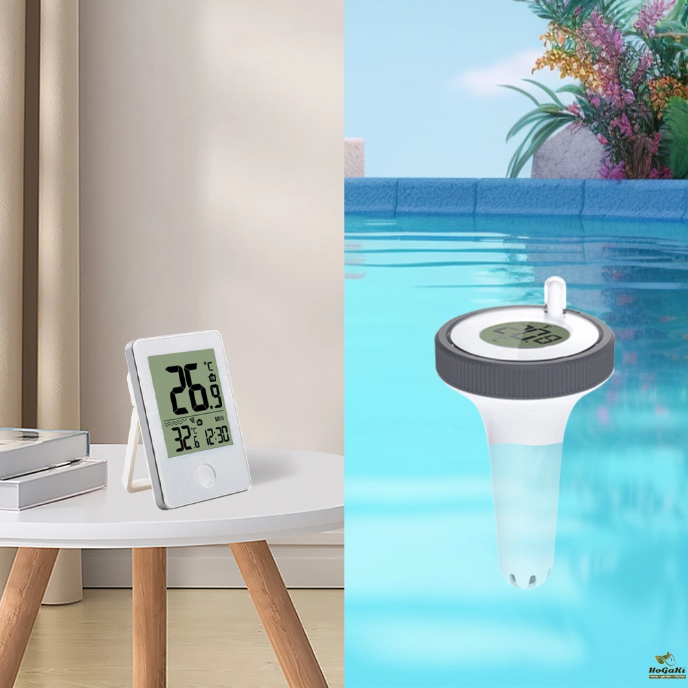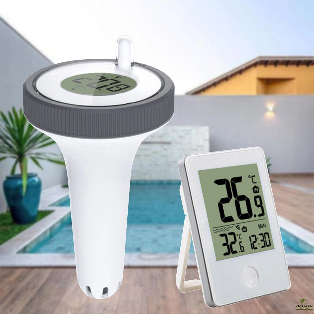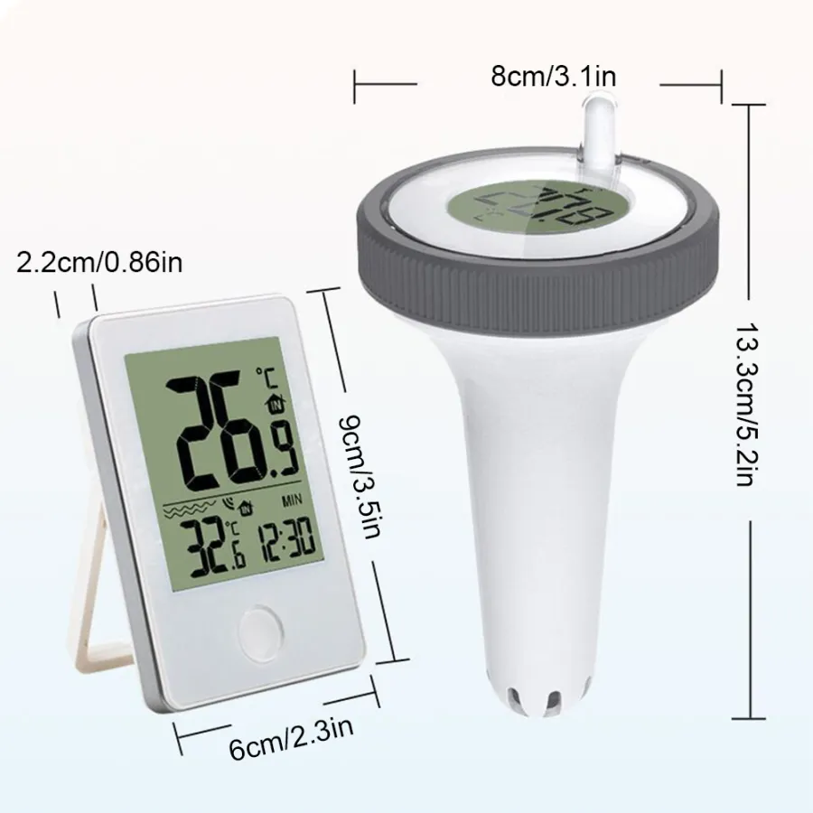 1.Wide Wireless Range: The digital pool thermometer has an impressive wireless connectivity range of up to 328 feet, allowing you to conveniently monitor temperature data from indoors without leaving your comfort. Specification: Origin: Mainland China Time display: 12/24H optional The real-time temperature of the water area where the sensor is located and the real-time indoor temperature of the host computer can be displayed on the same screen. Supports recording of the highest and lowest temperatures of the day. Indoor and outdoor temperature display: ℃/℉ optional. Indoor host temperature detection range: -9.9℃~+50℃ (14.2℉~122℉). Pool sensor temperature detection range: -40℃~+70℃ (-40℉~158℉). The temperature error is within ±1°C, and the transmission distance is 60 meters. Power Supply: Indoor host: 2x1.5V AAA alkaline batteries (not included): Size: 9*6cm Pool sensor: 2x1.5V AAA alkaline batteries (not included): Size: 13.3*8cm Material: ABS