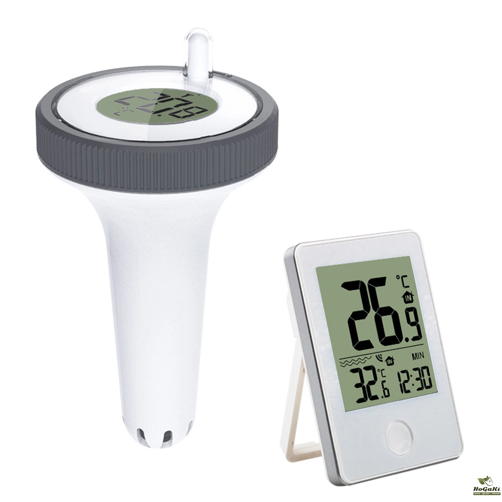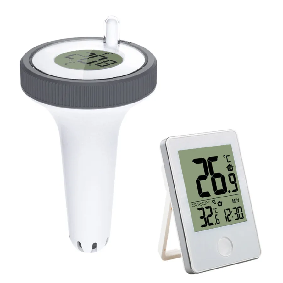 Feature: 1. Accurate Monitoring: This wireless floating pool temperature gauge continuously monitors the temperature of your pool or hot tub, providing real-time and accurate readings. 2. Clear LED Display: Equipped with a clear and easy-to-read LED display screen, this temperature gauge shows pool temperature in Celsius and Fahrenheit. 3. Durable: The floating wireless pool temperature gauge is made of durable materials that can withstand harsh pool conditions such as chlorine and other chemicals. It's built to last for years of use. 4. Convenient: With its sleek appearance, this wireless pool temperature gauge offers more convenience to your life. It comes with data such as time, indoor temperature and humidity, and pool temperature. 5. Easy to Read: The receiver screen of this wireless pool temperature gauge displays data very clearly and is easy to read, making it simple for anyone to use and understand. Specification: Size: 13.3 * 8cm/5.23 * 3.14inch 9 * 6cm/3.54 * 2.36inch Time display: 12/24H optional It can display the real-time temperature of the water area where the sensor is located and the indoor real-time temperature of the host on the same screen. Supports recording of the highest and lowest temperatures of the day. Indoor and outdoor temperature display: ℃/℉ optional. Indoor host temperature detection range: -9.9 ℃~+50 ℃ (14.2 ℉~122 ℉). The temperature detection range of the water tank sensor is -40 ℃~+70 ℃ (-40 ℉~158 ℉). Within an error of ± 1 ℃, the transmission distance is 60 meters. Power supply: Indoor host: 2x1.5V "AAA" Alkaline battery (not included in shipment) Outdoor sensor: 2x1.5V "AAA" Alkaline battery (not included in shipment)  Note: