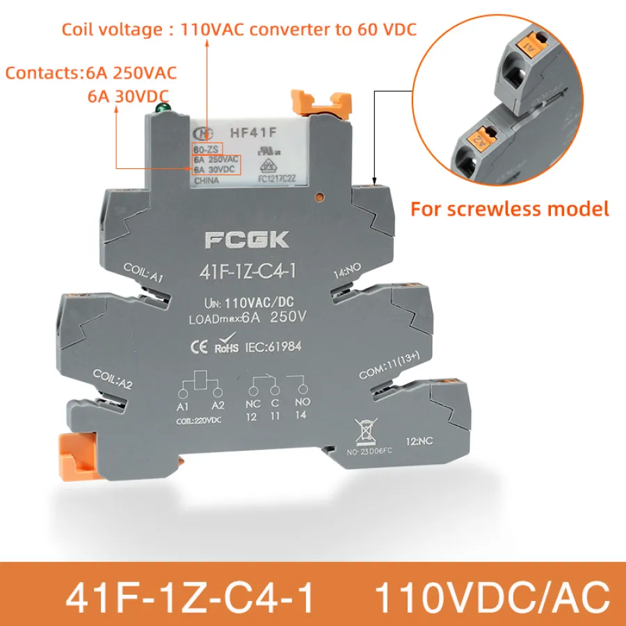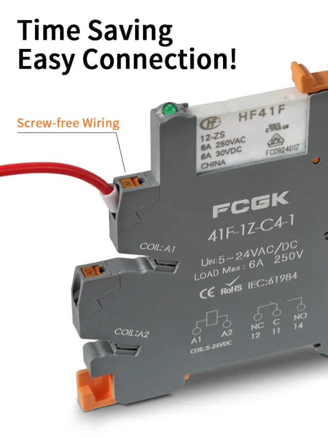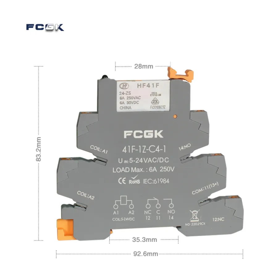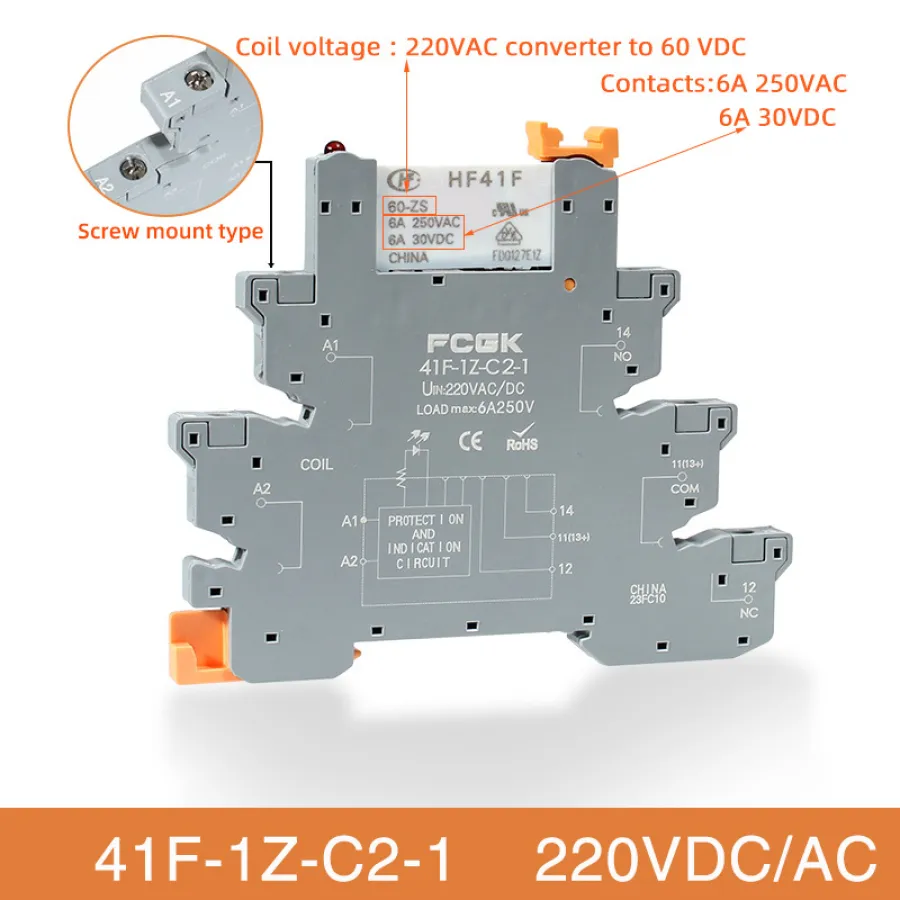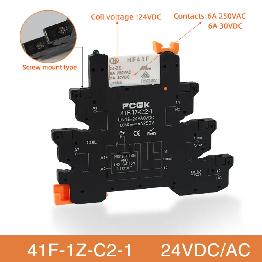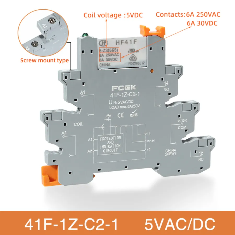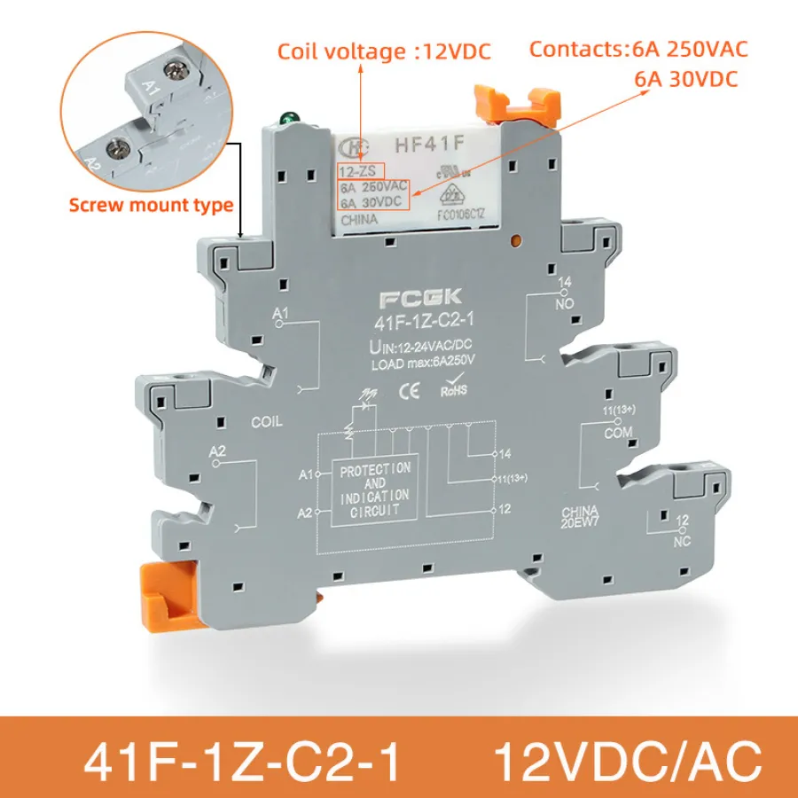 Slim Relay Module Protection Circuit 6A Relay 12VAC/DC or 24VAC/DC Relay Socket 6.2mm thickness