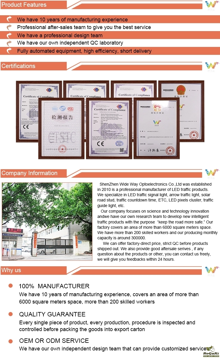 ShenZhen Wide Way Optoelectronics Co.,Ltd is a professional manufacturer of LED traffic products .We specilize in LED traffic singal light ,arrow traffic light ,solar road stud ,traffic countdown timer,ETC ,LED pixels cluster ,traffic guide light .etc