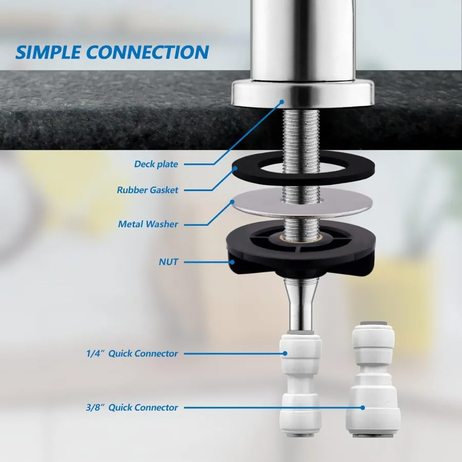Easy Installation: Stylish and modern design drinking water filter faucet comes with deck plate, two washers and nut. You will find it’s simple to install underneath the countertop. We also provide 1/4" and 3/ 8"quick connectors, to fit your different installation needs.
