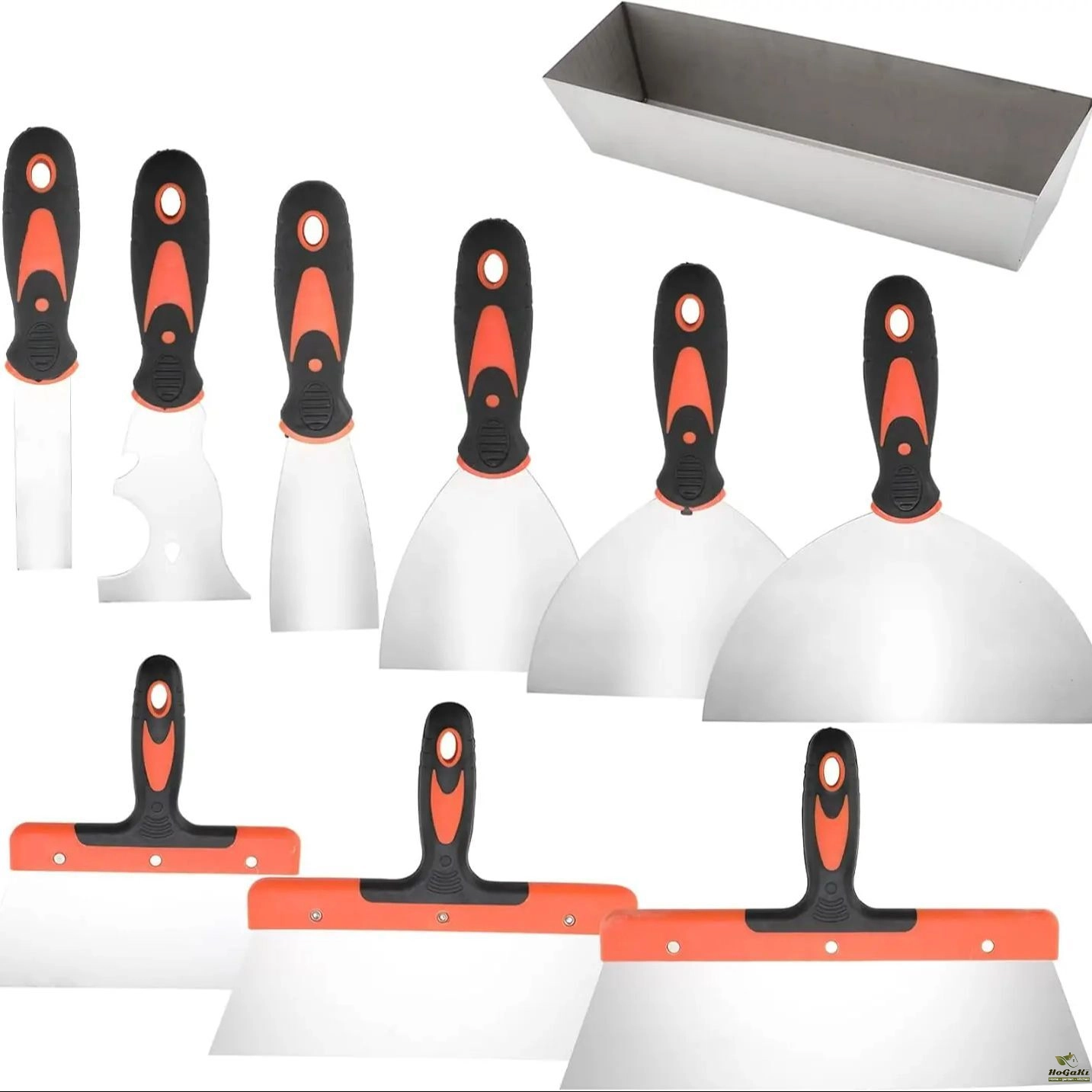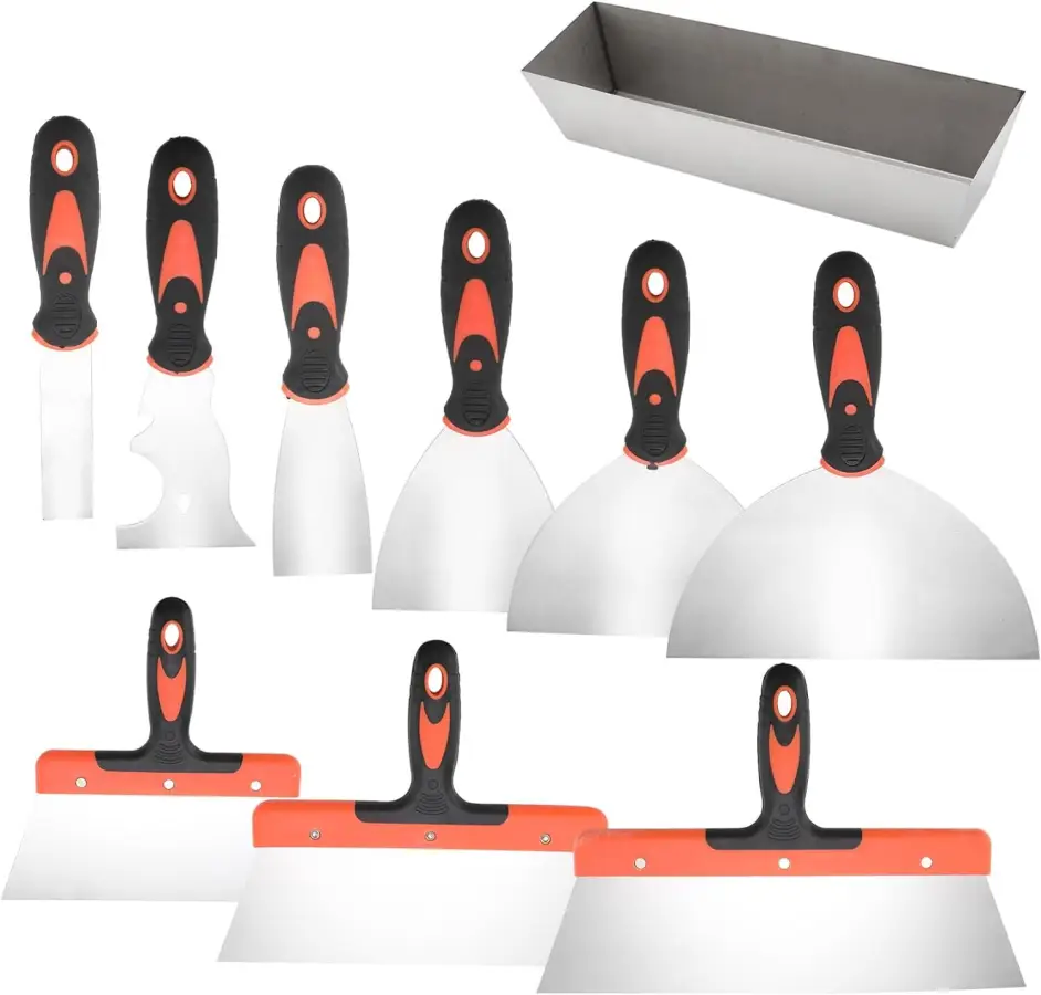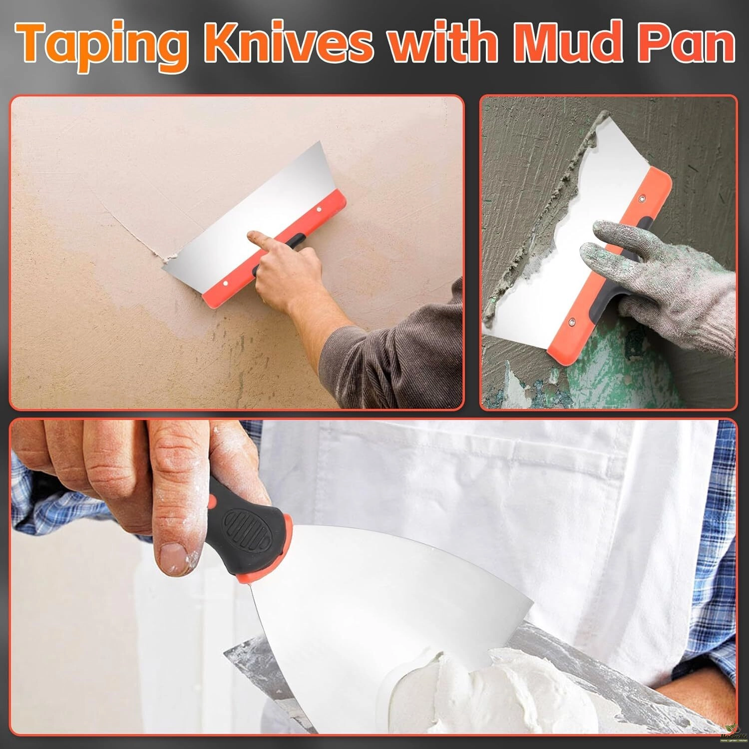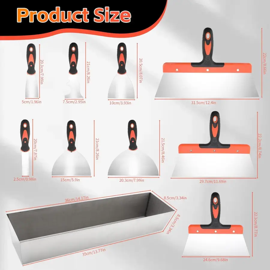 【Versatile Sizes】:With 9 different sizes(1inch,2inch,3inch,4inch,6inch,8inch,10inch,12inch,14inch)of drywall tools paired with a 14-inch mud pan, this set is perfect for applying joint compound, scraping windows, scraping paint, removing loose plaster or paint, as well as patching dents, cracks, and holes in plaster. It is also suitable for wallpaper, decals, backing, repairs, painting, plastering, and other tasks.